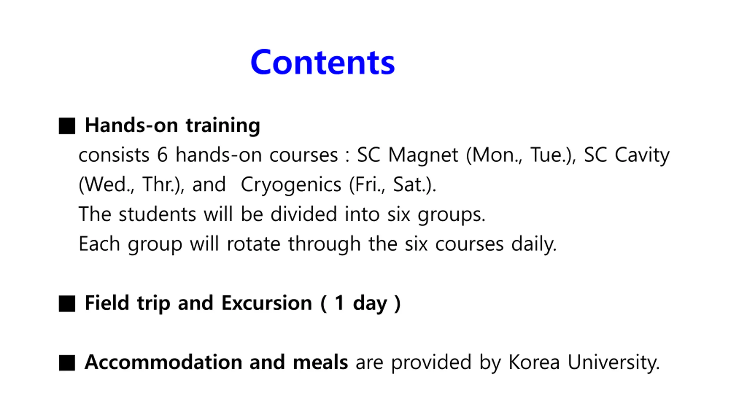 Contents Hands-on training consists 6 hands-on courses : SC Magnet (Mon., Tue.), SC Cavity (Wed., Thr.), and Cryogenics (Fri., Sat.). The students will be divided into six groups. Each group will rotate through the six courses daily. Field trip and Excursion ( 1 day ) Accommodation and meals are provided by Korea University.