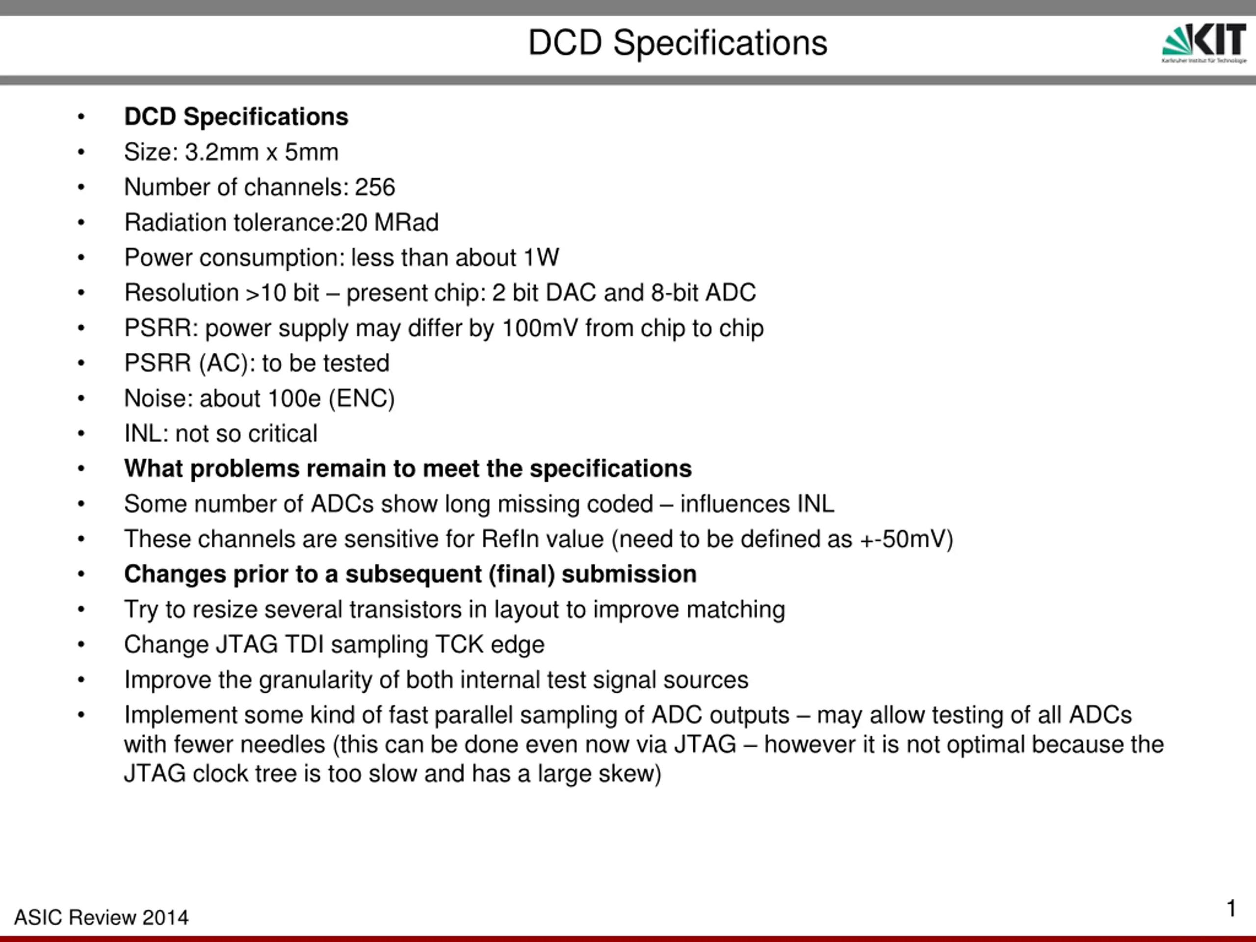 DCD Specifications DCD Specifications Size: 3.2mm x 5mm Number of channels: 256 Radiation tolerance:20 MRad Power consumption: less than about 1W Resolution >10 bit present chip: 2 bit DAC and 8-bit ADC PSRR: power supply may differ by 100mV from chip to chip PSRR (AC): to be tested Noise: about 100e (ENC) INL: not so critical What problems remain to meet the specifications Some number of ADCs show long missing coded influences INL These channels are sensitive for RefIn value (need to be defined as +-50mV) Changes prior to a subsequent (final) submission Try to resize several transistors in layout to improve matching Change JTAG TDI sampling TCK edge Improve the granularity of both internal test signal sources Implement some kind of fast parallel sampling of ADC outputs may allow testing of all ADCs with fewer needles (this can be done even now via JTAG however it is not optimal because the JTAG clock tree is too slow and has a large skew) 1 ASIC Review 2014