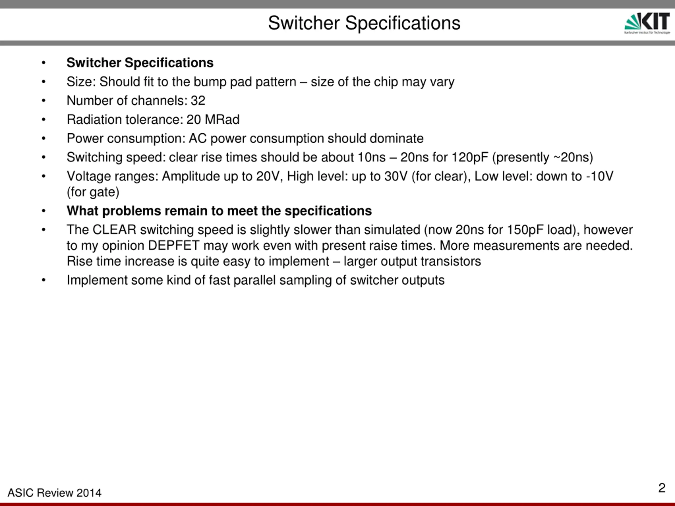 Switcher Specifications Switcher Specifications Size: Should fit to the bump pad pattern size of the chip may vary Number of channels: 32 Radiation tolerance: 20 MRad Power consumption: AC power consumption should dominate Switching speed: clear rise times should be about 10ns 20ns for 120pF (presently ~20ns) Voltage ranges: Amplitude up to 20V, High level: up to 30V (for clear), Low level: down to -10V (for gate) What problems remain to meet the specifications The CLEAR switching speed is slightly slower than simulated (now 20ns for 150pF load), however to my opinion DEPFET may work even with present raise times. More measurements are needed. Rise time increase is quite easy to implement larger output transistors Implement some kind of fast parallel sampling of switcher outputs 2 ASIC Review 2014