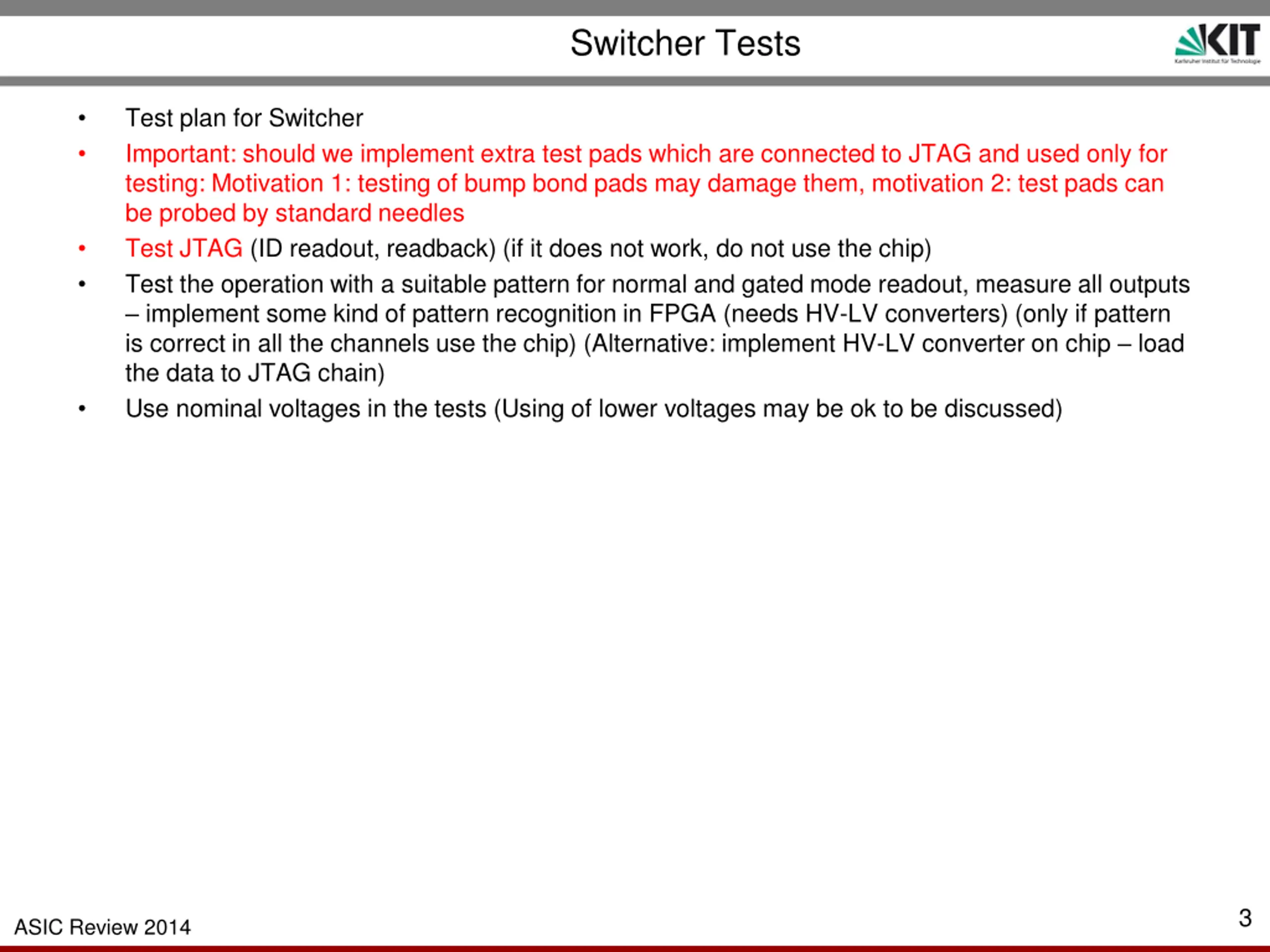 Switcher Tests Test plan for Switcher Important: should we implement extra test pads which are connected to JTAG and used only for testing: Motivation 1: testing of bump bond pads may damage them, motivation 2: test pads can be probed by standard needles Test JTAG (ID readout, readback) (if it does not work, do not use the chip) Test the operation with a suitable pattern for normal and gated mode readout, measure all outputs implement some kind of pattern recognition in FPGA (needs HV-LV converters) (only if pattern is correct in all the channels use the chip) (Alternative: implement HV-LV converter on chip load the data to JTAG chain) Use nominal voltages in the tests (Using of lower voltages may be ok to be discussed) 3 ASIC Review 2014