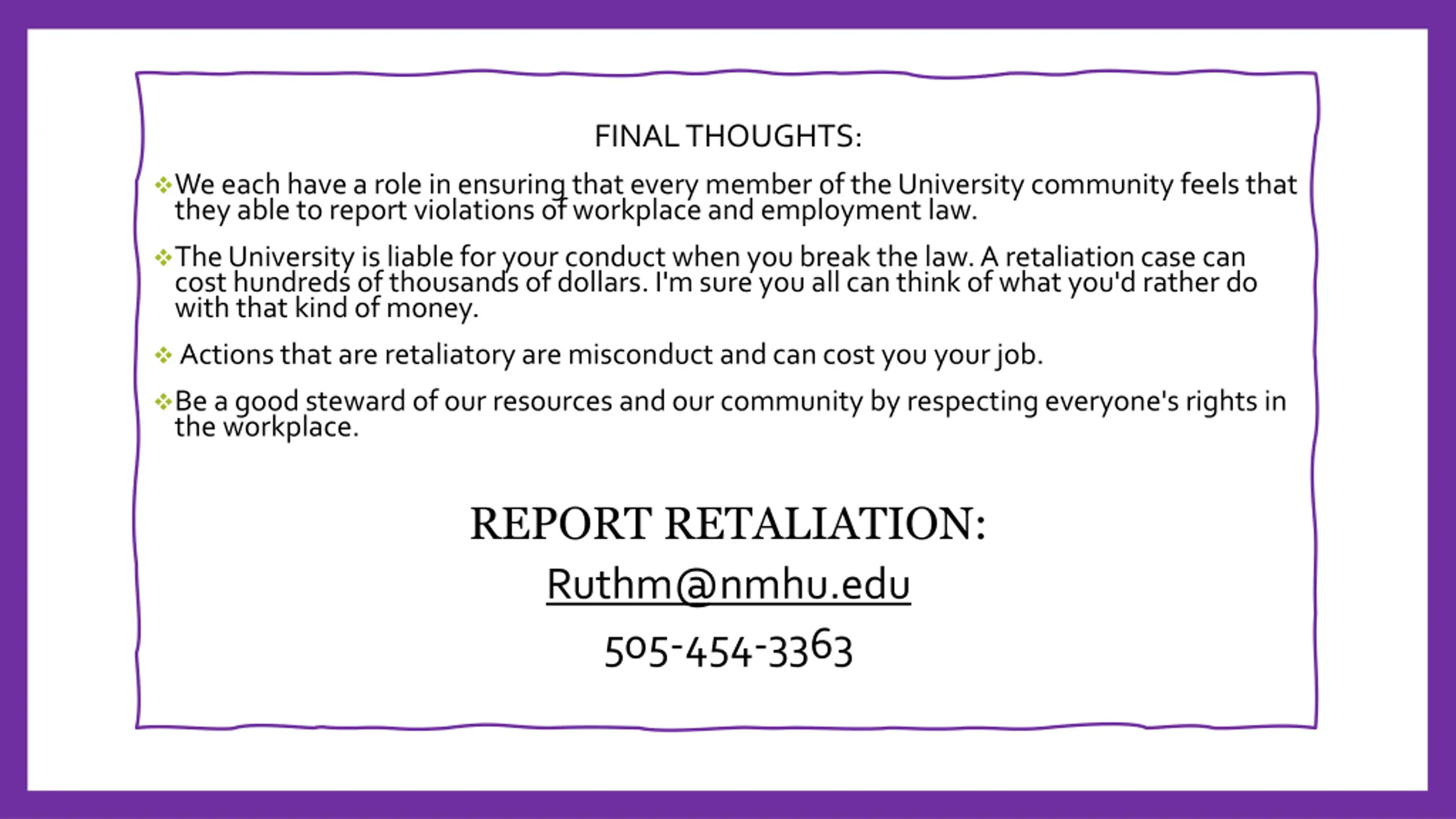 FINAL THOUGHTS: We each have a role in ensuring that every member of the University community feels that they able to report violations of workplace and employment law. The University is liable for your conduct when you break the law. A retaliation case can cost hundreds of thousands of dollars. I'm sure you all can think of what you'd rather do with that kind of money. Actions that are retaliatory are misconduct and can cost you your job. Be a good steward of our resources and our community by respecting everyone's rights in the workplace. REPORT RETALIATION: Ruthm@nmhu.edu 505-454-3363