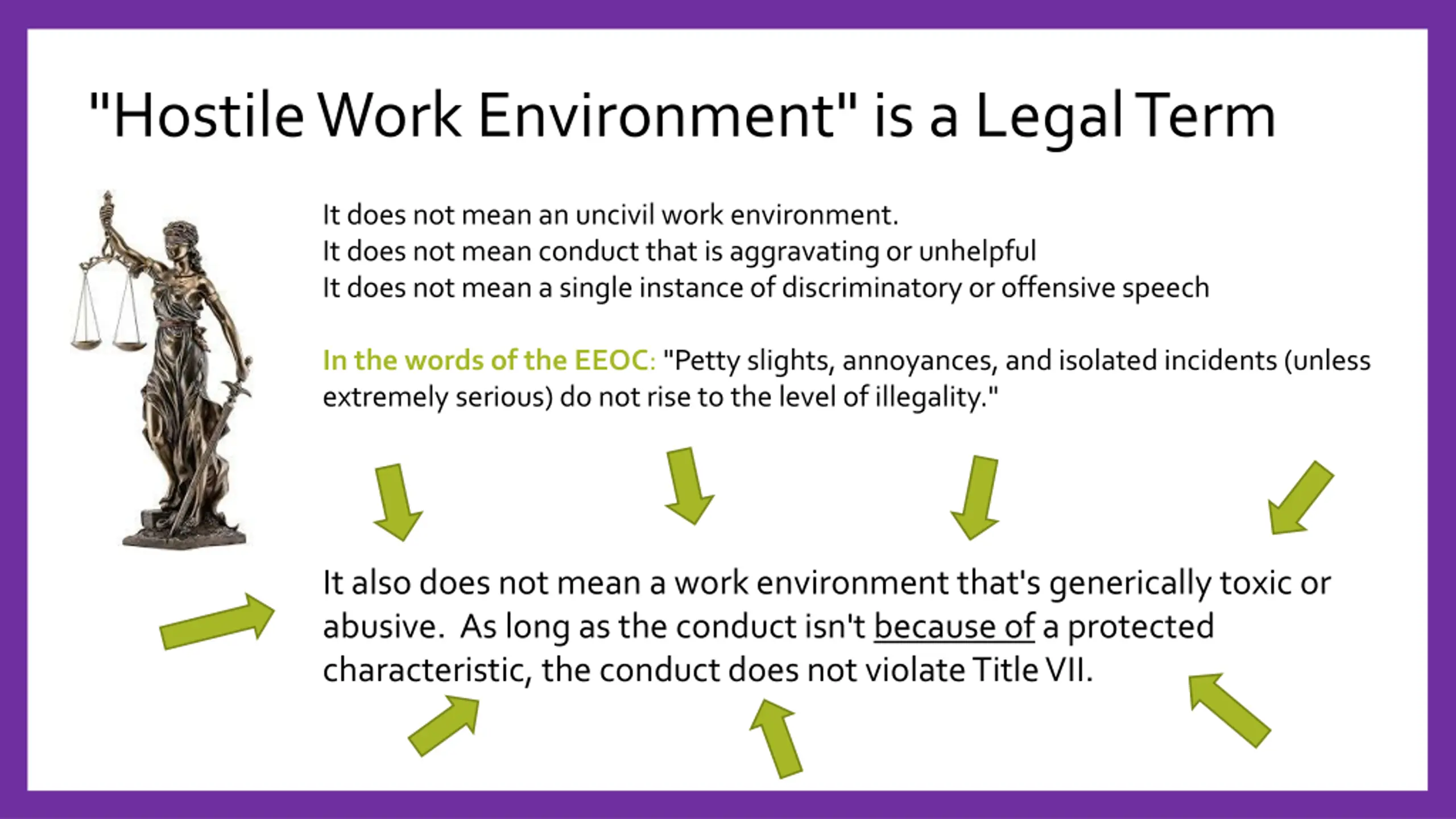 "Hostile Work Environment" is a Legal Term It does not mean an uncivil work environment. Itdoes notmean conduct that is aggravating or unhelpful It does not mean a single instance of discriminatory or offensive speech In the words of the EEOC: "Petty slights, annoyances, and isolatedincidents (unless extremely serious) do not rise to the level of illegality." It alsodoes not mean a work environment that's generically toxic or abusive. As long as the conduct isn't because of a protected characteristic, the conduct does not violate Title VII.