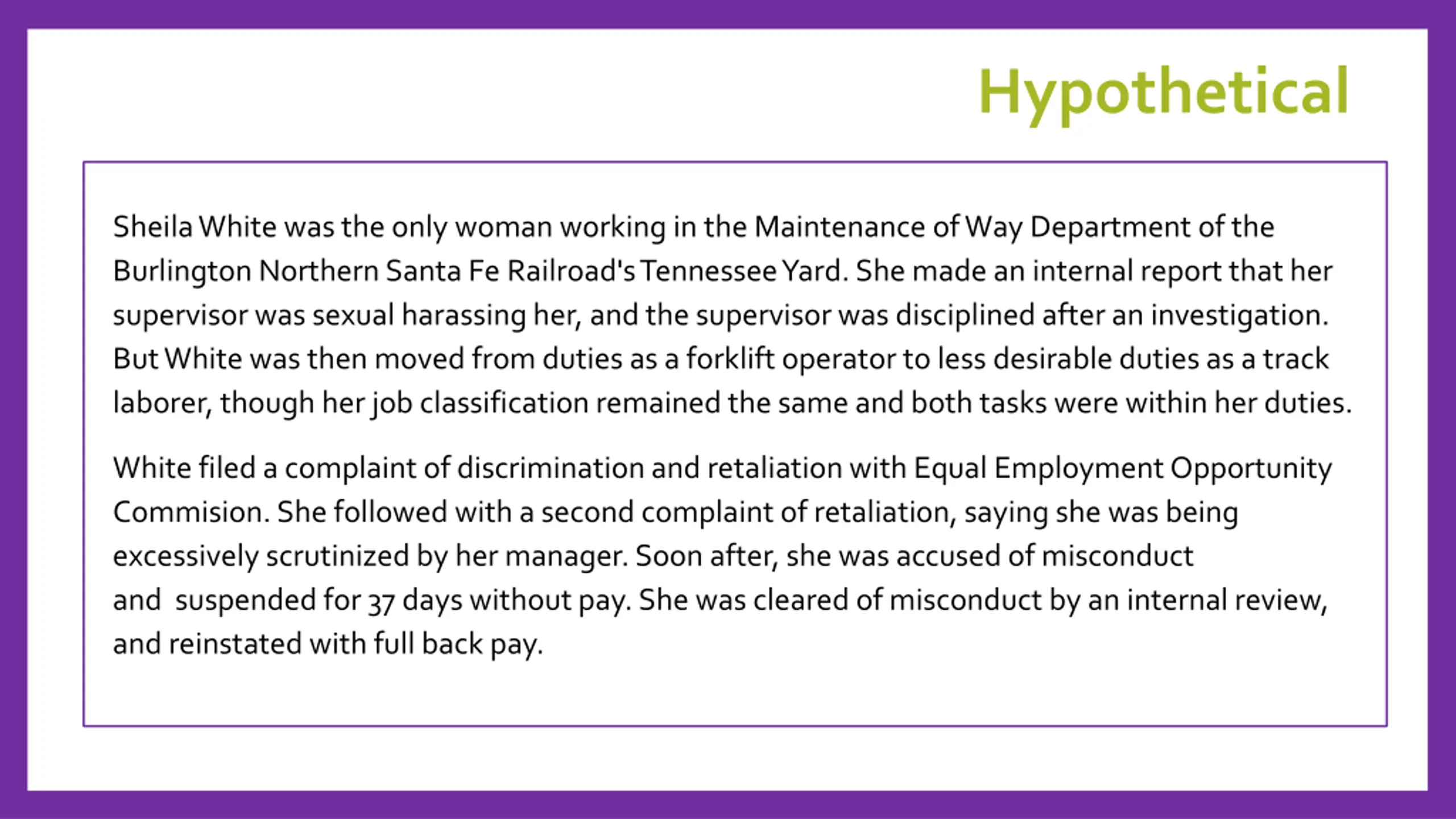 Hypothetical Sheila White was the only woman working in the Maintenance of Way Department of the Burlington Northern Santa Fe Railroad's Tennessee Yard. She made an internal report that her supervisor was sexual harassing her, and the supervisor was disciplined after an investigation. But White was then moved from duties as a forklift operator to less desirable duties as a track laborer, though her job classification remained the same and both tasks were within her duties. White filed a complaint of discrimination and retaliation with Equal Employment Opportunity Commision. She followed with a second complaint of retaliation, saying she was being excessively scrutinized by her manager. Soon after, she was accused of misconduct and suspended for 37 days without pay. She was cleared of misconduct by an internal review, and reinstated with full back pay.
