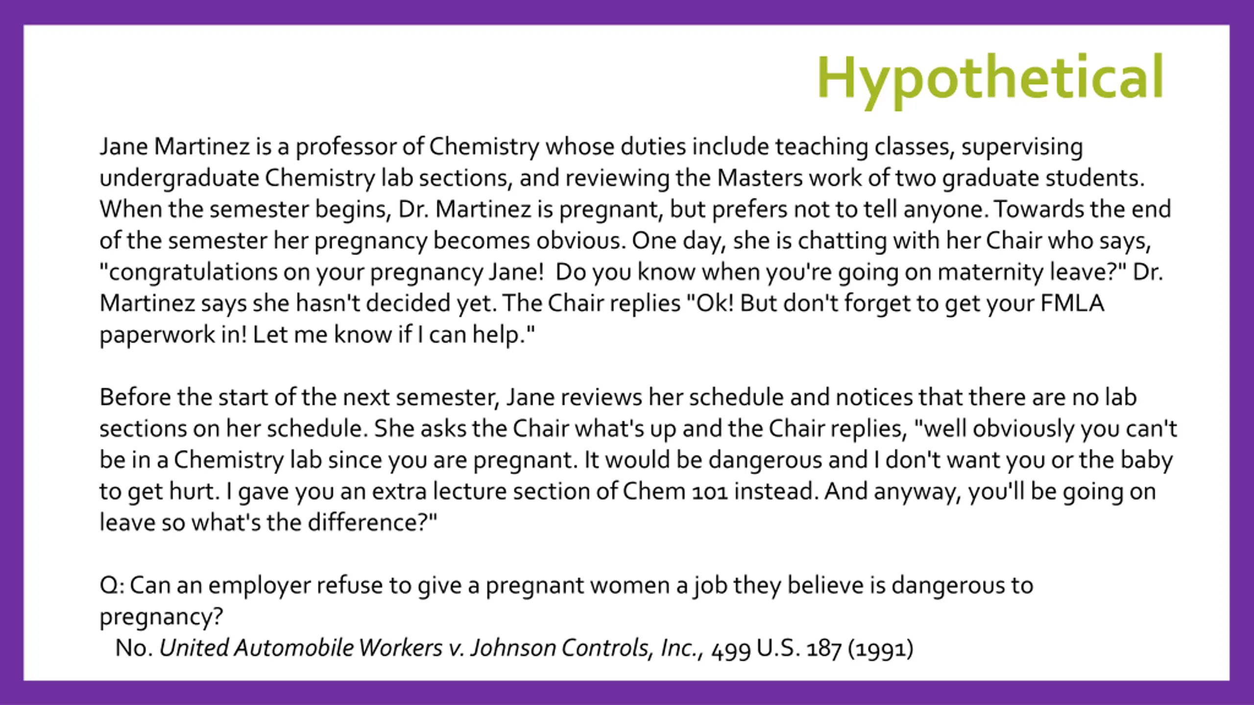 Hypothetical Jane Martinez is a professor of Chemistry whose duties include teaching classes, supervising undergraduate Chemistry lab sections, and reviewing the Masters work of two graduate students. When the semester begins, Dr. Martinez is pregnant, but prefers not to tell anyone. Towards the end of the semester her pregnancy becomes obvious. One day, she is chatting with her Chair who says, "congratulations on your pregnancy Jane! Do you know when you're going on maternity leave?" Dr. Martinez says she hasn't decided yet. The Chair replies "Ok! But don't forget to get your FMLA paperwork in! Let me know if I can help." Before the start of the next semester, Jane reviews her schedule and notices that there are no lab sections on her schedule. She asks the Chair what's up and the Chair replies, "well obviously you can't be in a Chemistry lab since you are pregnant. It would be dangerous and I don't want you or the baby to get hurt. I gave you an extra lecture section of Chem 101 instead. And anyway, you'll be going on leave so what's the difference?" Q: Can an employer refuse to give a pregnant women a job they believe is dangerous to pregnancy? No.United Automobile Workers v. Johnson Controls, Inc.,499 U.S. 187 (1991)