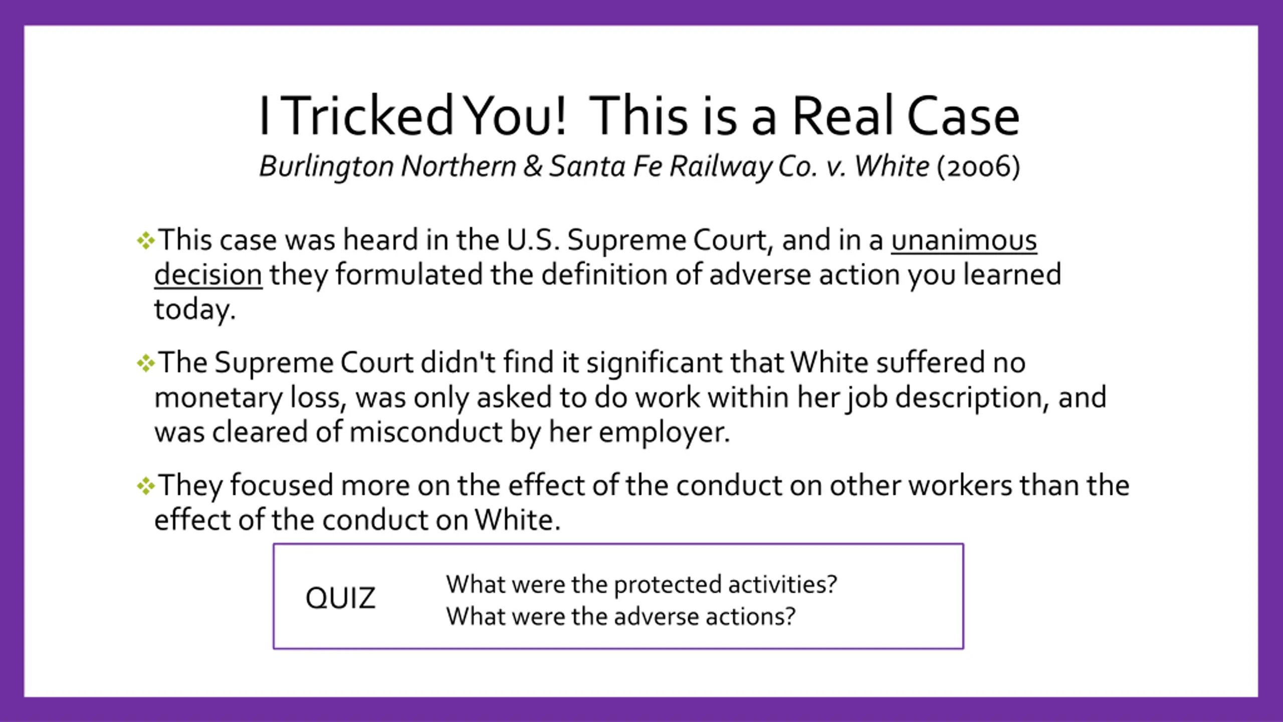 I Tricked You! This is a Real Case Burlington Northern & Santa Fe Railway Co. v. White (2006) This case was heard in the U.S. Supreme Court, and in a unanimous decision they formulated the definition of adverse action you learned today. The Supreme Court didn't find it significant that White suffered no monetary loss, was onlyasked to do work within her job description, and was cleared of misconduct by her employer. They focused more on the effect of the conduct on other workers than the effect of the conducton White. What were the protected activities? What were the adverse actions? QUIZ