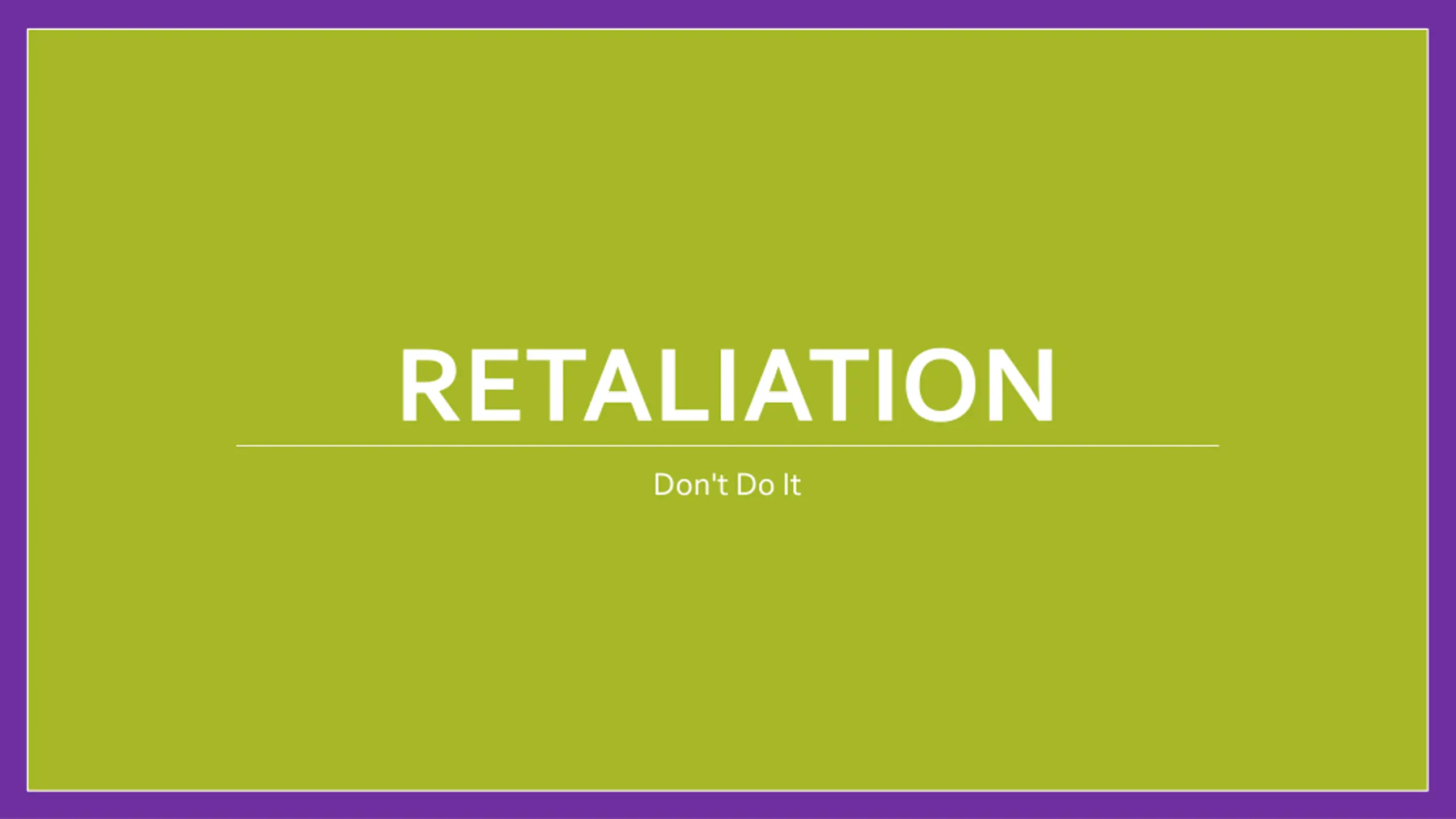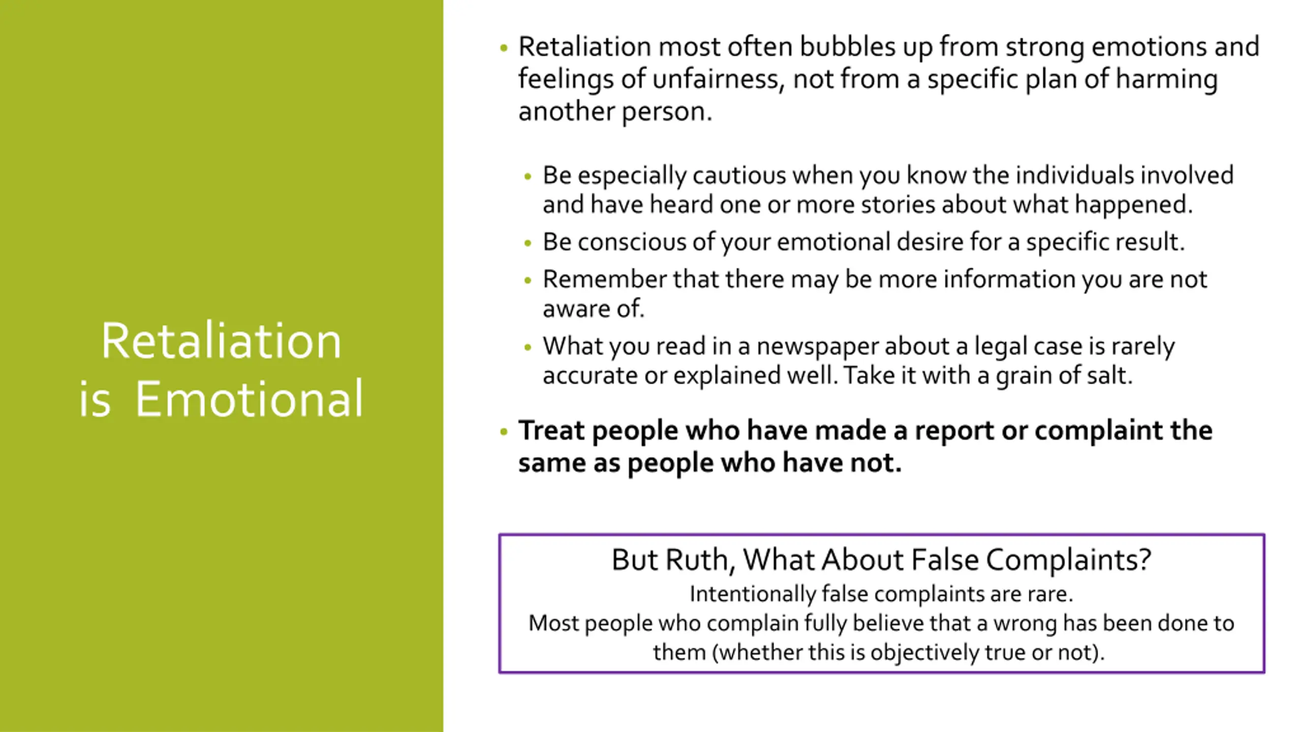 Retaliation most often bubbles up from strong emotions and feelings of unfairness, not from a specific plan of harming another person. Be especially cautious when you know the individuals involved and have heard one or more stories about what happened. Be conscious of your emotional desire for a specific result. Remember that there may be more information you are not aware of. What you read in a newspaper about a legal case is rarely accurate or explained well. Take it with a grain of salt. Retaliation is Emotional Treat people who have made a report or complaint the same as people who have not. But Ruth, What About False Complaints? Intentionally false complaints are rare. Most people who complain fully believe that a wrong has been done to them (whether this is objectively true or not).