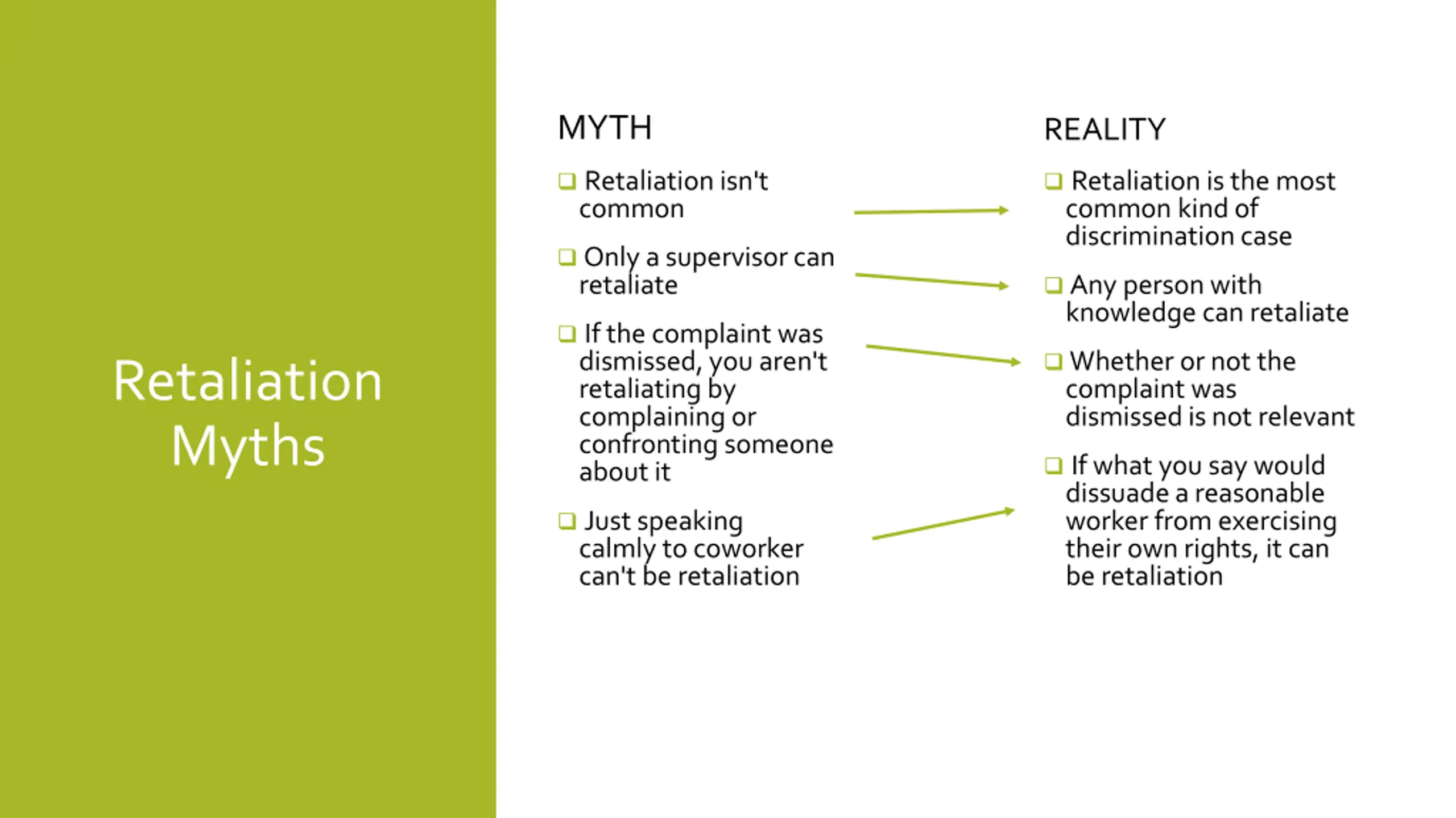 MYTH REALITY Retaliation isn't common Retaliation is the most common kind of discrimination case Only a supervisor can retaliate Any person with knowledge can retaliate If the complaint was dismissed, you aren't retaliating by complaining or confronting someone about it Whether or not the complaint was dismissed is not relevant Retaliation Myths If what you say would dissuade a reasonable worker from exercising their own rights, it can beretaliation Just speaking calmlyto coworker can't be retaliation