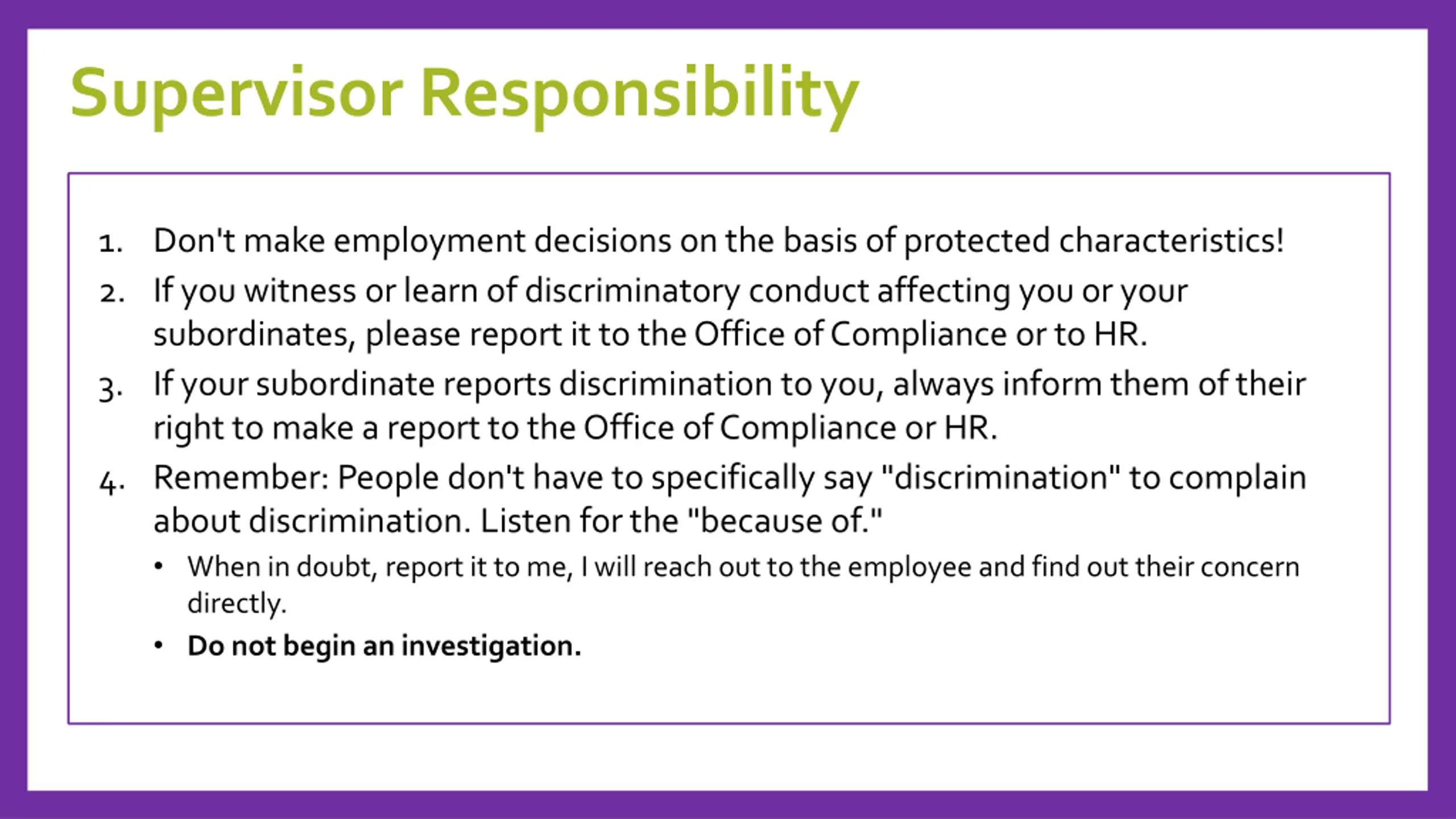 Supervisor Responsibility 1. Don't make employment decisions on the basis of protected characteristics! 2. If you witness or learn of discriminatory conduct affecting you or your subordinates, please report it to the Office of Compliance or to HR. 3. If your subordinate reports discrimination to you, always inform them of their right to make a report to the Office of Compliance or HR. 4. Remember: People don't have to specifically say "discrimination" to complain about discrimination. Listen for the "because of." When in doubt, report it to me, I will reach out to the employee and find out their concern directly. Do not begin an investigation.