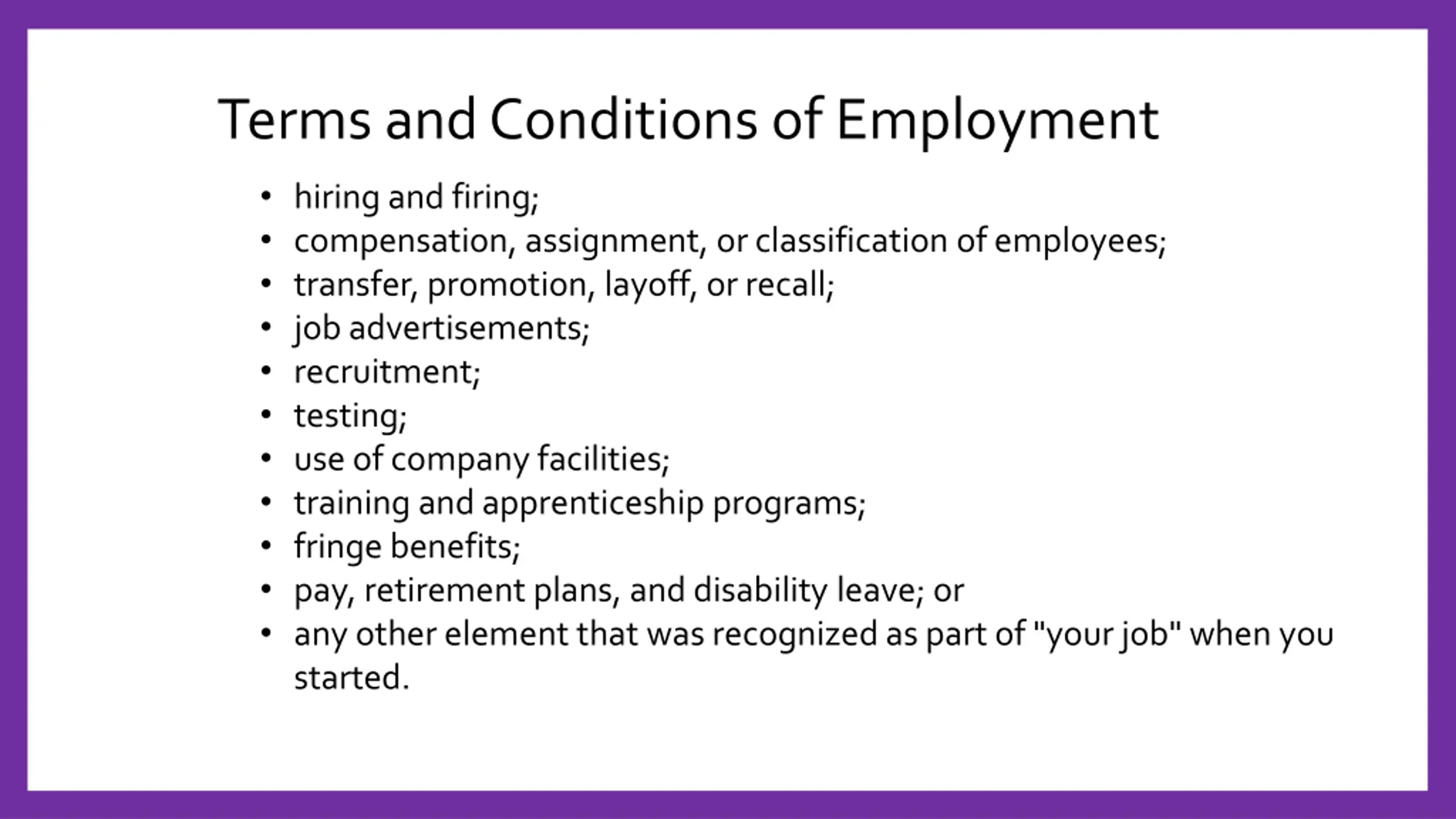 Terms and Conditions of Employment hiring and firing; compensation, assignment, or classification of employees; transfer, promotion, layoff, or recall; job advertisements; recruitment; testing; use of company facilities; training and apprenticeship programs; fringe benefits; pay, retirement plans, and disability leave; or any other element that was recognized as part of "your job" when you started.