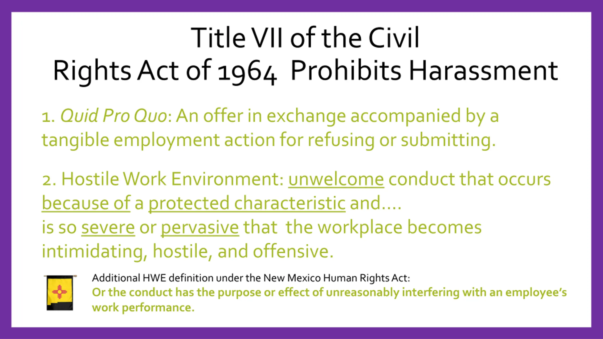 Title VII of the Civil RightsActof 1964 Prohibits Harassment 1. Quid Pro Quo: An offer in exchangeaccompanied by a tangible employment action for refusing or submitting. 2. Hostile Work Environment: unwelcome conduct that occurs because of a protected characteristicand.... is so severeor pervasive that the workplace becomes intimidating, hostile, and offensive. Additional HWE definition under the New Mexico Human Rights Act: Or the conduct has the purpose or effect of unreasonably interfering with anemployee s work performance.