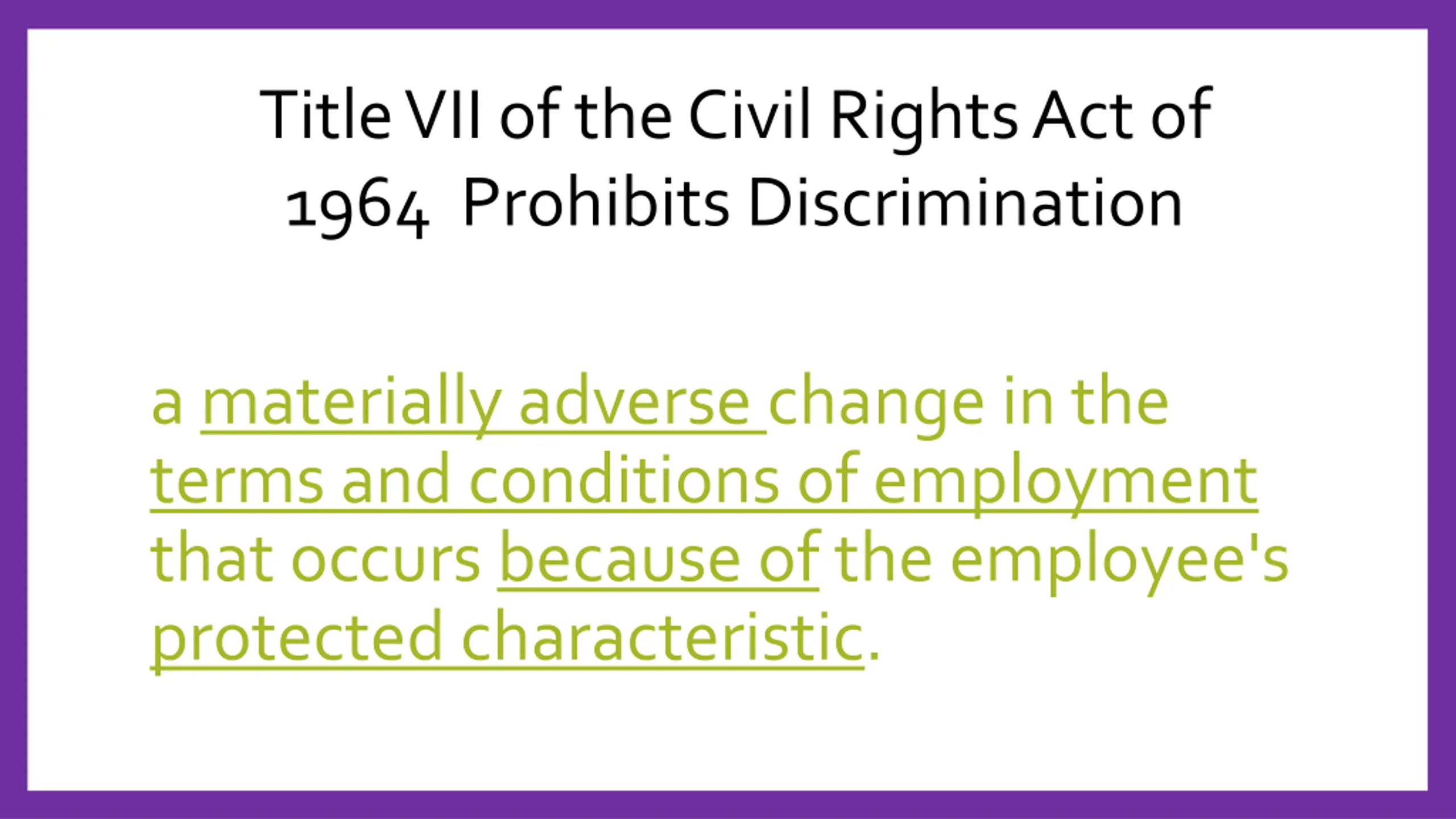 Title VII of the Civil Rights Act of 1964 Prohibits Discrimination a materially adverse change in the terms and conditions of employment that occurs because of the employee's protected characteristic.