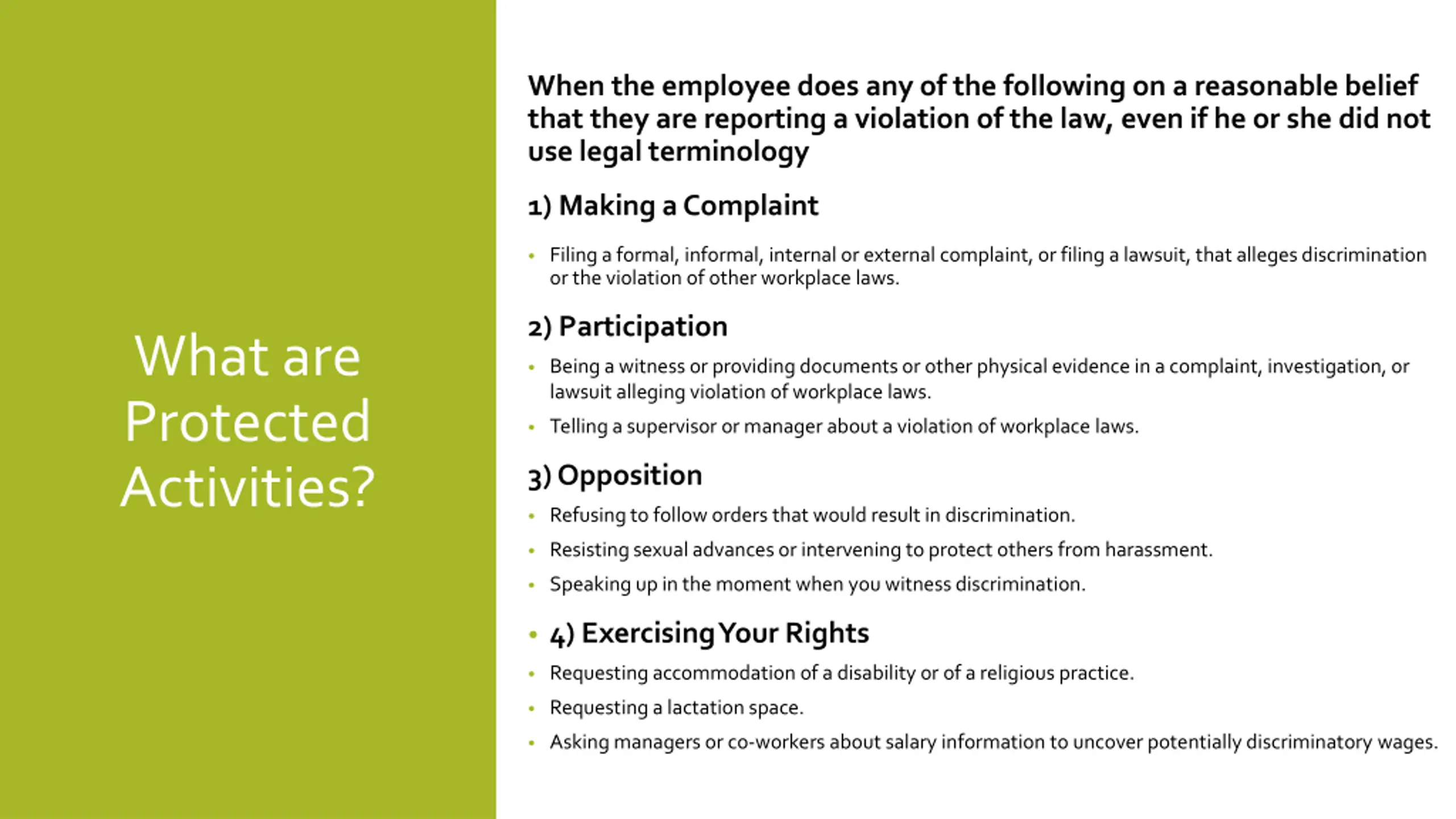 When the employee does any of the following on a reasonablebelief that they are reporting a violation of the law, even if he or she did not use legalterminology 1) Making a Complaint Filing a formal, informal, internal or external complaint, or filing a lawsuit, that alleges discrimination or theviolation of other workplace laws. 2) Participation What are Protected Activities? Being a witness or providing documents or other physical evidence in a complaint, investigation, or lawsuit alleging violation of workplace laws. Telling a supervisor or manager about a violation of workplace laws. 3) Opposition Refusing to follow orders that would result in discrimination. Resisting sexual advances or intervening to protect others from harassment. Speaking up in the moment when you witness discrimination. 4) Exercising Your Rights Requestingaccommodation of a disability or of a religious practice. Requestinga lactation space. Askingmanagers or co-workers about salary information to uncover potentially discriminatory wages.
