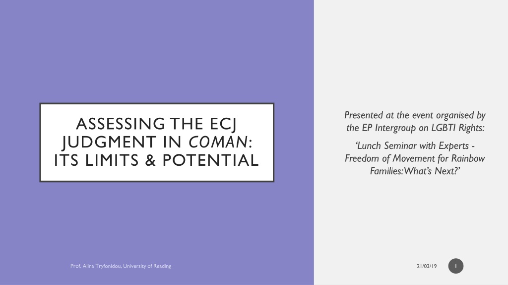 Presented at the event organised by the EP Intergroup on LGBTI Rights: ASSESSING THE ECJ JUDGMENT IN COMAN: ITS LIMITS & POTENTIAL Lunch Seminar with Experts - Freedom of Movement for Rainbow Families: What s Next? 1