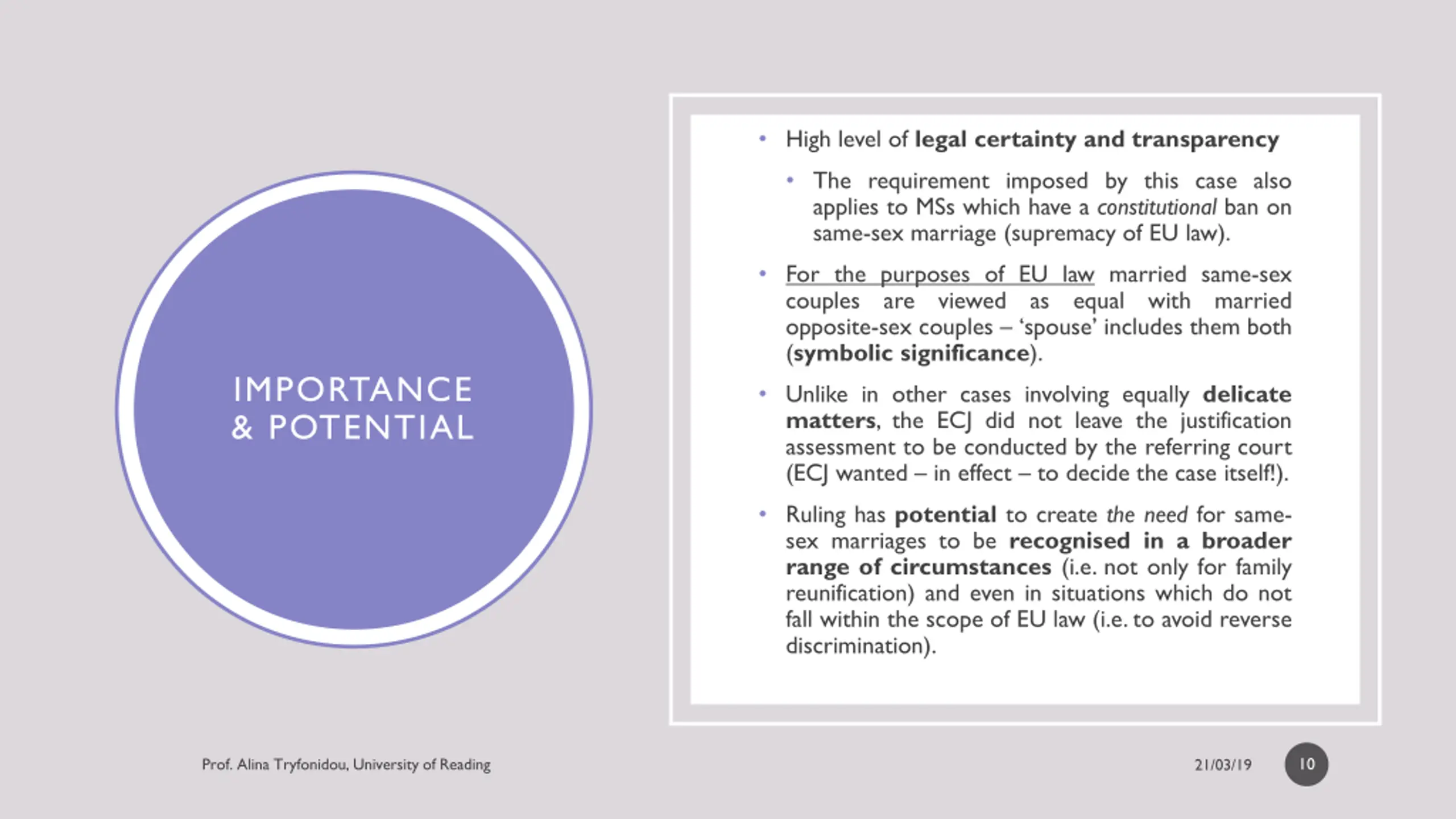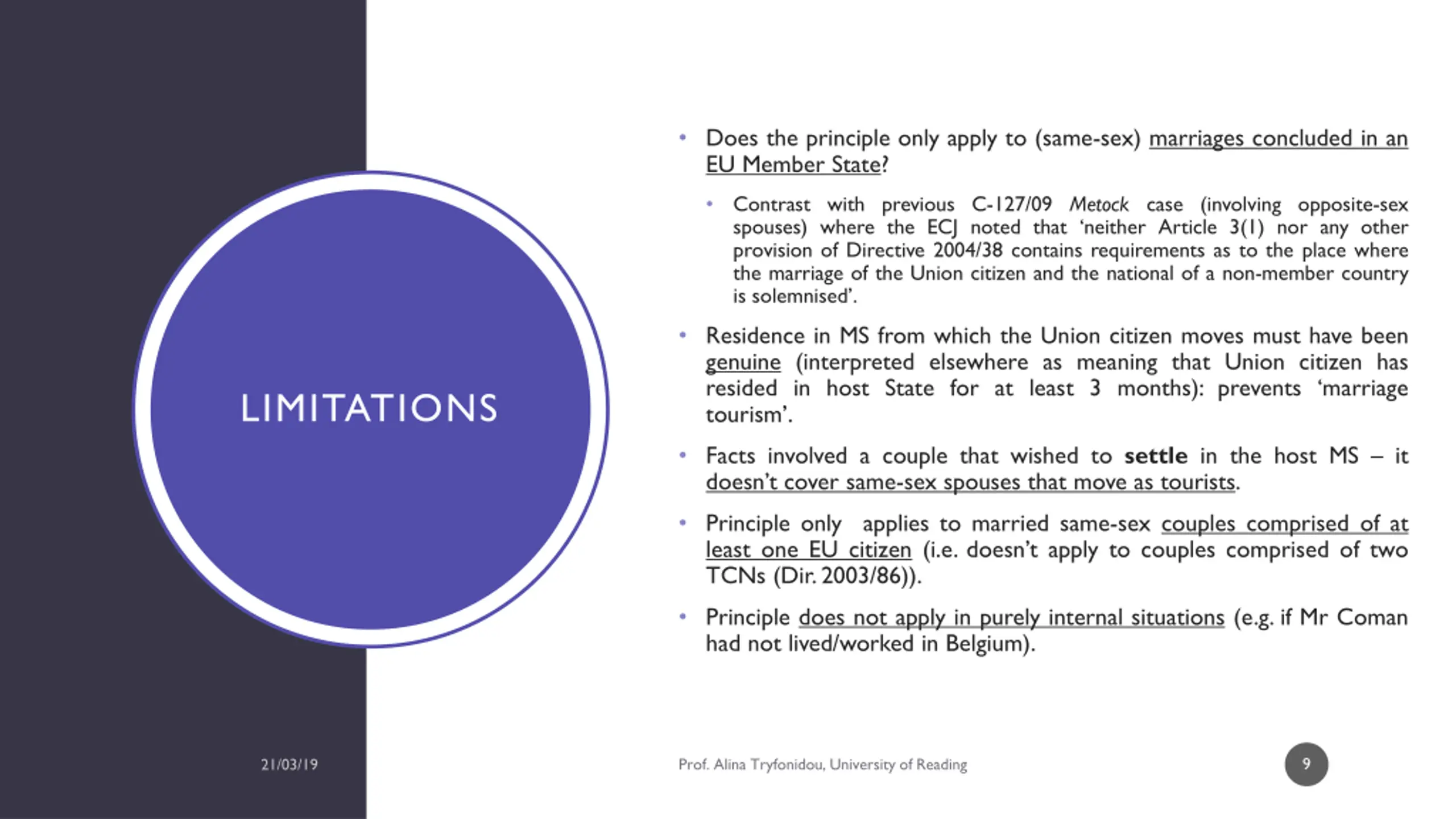 Does the principle only apply to (same-sex) marriages concluded in an EU Member State? Contrast with previous C-127/09 Metock case (involving opposite-sex spouses) where the ECJ noted that neither Article 3(1) nor any other provision of Directive 2004/38 contains requirements as to the place where the marriage of the Union citizen and the national of a non-member country is solemnised . Residence in MS from which the Union citizen moves must have been genuine (interpreted elsewhere as meaning that Union citizen has resided in host State for at least 3 months): prevents marriage tourism . LIMITATIONS Facts involved a couple that wished to settle in the host MS it doesn t cover same-sex spouses that move as tourists. Principle only applies to married same-sex couples comprised of at least one EU citizen (i.e. doesn t apply to couples comprised of two TCNs (Dir. 2003/86)). Principle does not apply in purely internal situations (e.g. if Mr Coman had not lived/worked in Belgium). 9