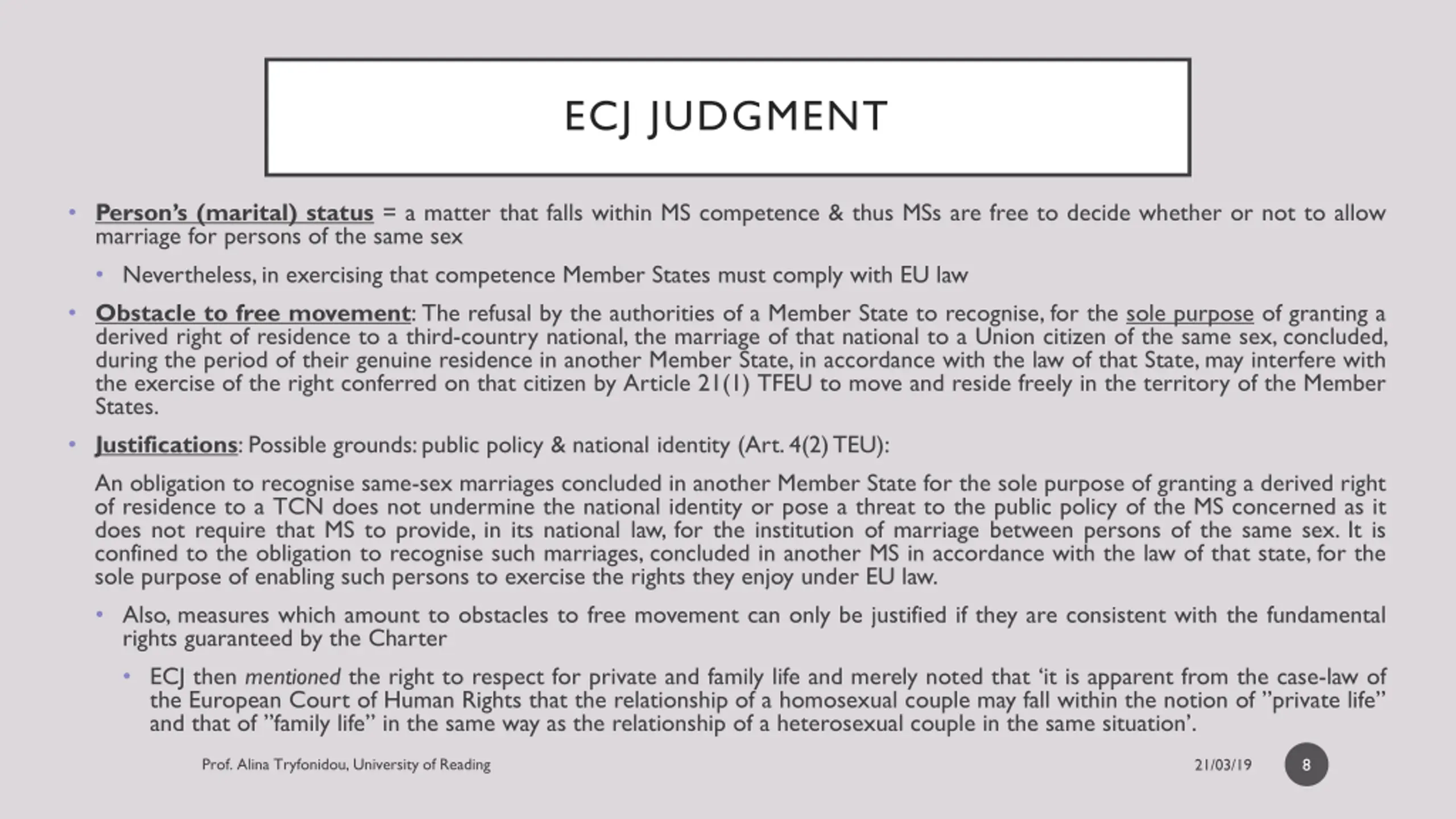 ECJ JUDGMENT Person s (marital) status = a matter that falls within MS competence & thus MSs are free to decide whether or not to allow marriage for persons of the same sex Nevertheless, in exercising that competence Member States must comply with EU law Obstacle to free movement: The refusal by the authorities of a Member State to recognise, for the sole purpose of granting a derived right of residence to a third-country national, the marriage of that national to a Union citizen of the same sex, concluded, during the period of their genuine residence in another Member State, in accordance with the law of that State, may interfere with the exercise of the right conferred on that citizen by Article 21(1) TFEU to move and reside freely in the territory of the Member States. Justifications: Possible grounds: public policy & national identity (Art. 4(2) TEU): An obligation to recognise same-sex marriages concluded in another Member State for the sole purpose of granting a derived right of residence to a TCN does not undermine the national identity or pose a threat to the public policy of the MS concerned as it does not require that MS to provide, in its national law, for the institution of marriage between persons of the same sex. It is confined to the obligation to recognise such marriages, concluded in another MS in accordance with the law of that state, for the sole purpose of enabling such persons to exercise the rights they enjoy under EU law. Also, measures which amount to obstacles to free movement can only be justified if they are consistent with the fundamental rights guaranteed by the Charter ECJ then mentioned the right to respect for private and family life and merely noted that it is apparent from the case-law of the European Court of Human Rights that the relationship of a homosexual couple may fall within the notion of privatelife and that of familylife in the same way as the relationship of a heterosexual couple in the same situation . 8
