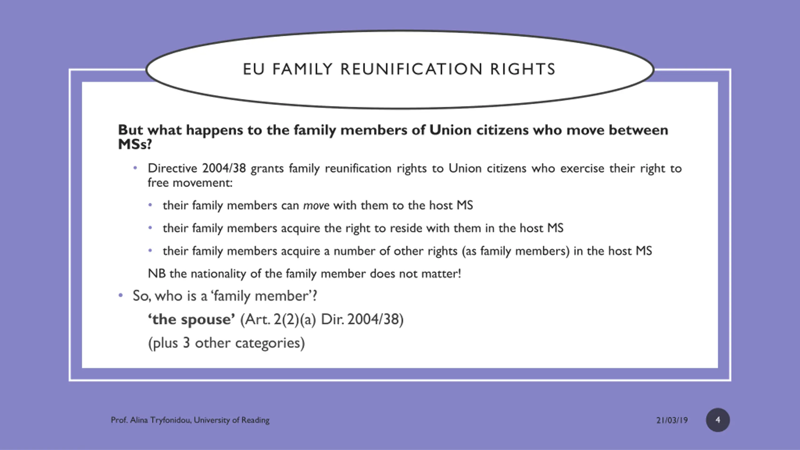 EU FAMILY REUNIFICATION RIGHTS But what happens to the family members of Union citizens who move between MSs? Directive 2004/38 grants family reunification rights to Union citizens who exercise their right to free movement: their family members can move with them to the host MS their family members acquire the right to reside with them in the host MS their family members acquire a number of other rights (as family members) in the host MS NB the nationality of the family member does not matter! So, who is a familymember ? thespouse (Art. 2(2)(a) Dir. 2004/38) (plus 3 other categories) 4 Prof. Alina Tryfonidou, University of Reading 21/03/19