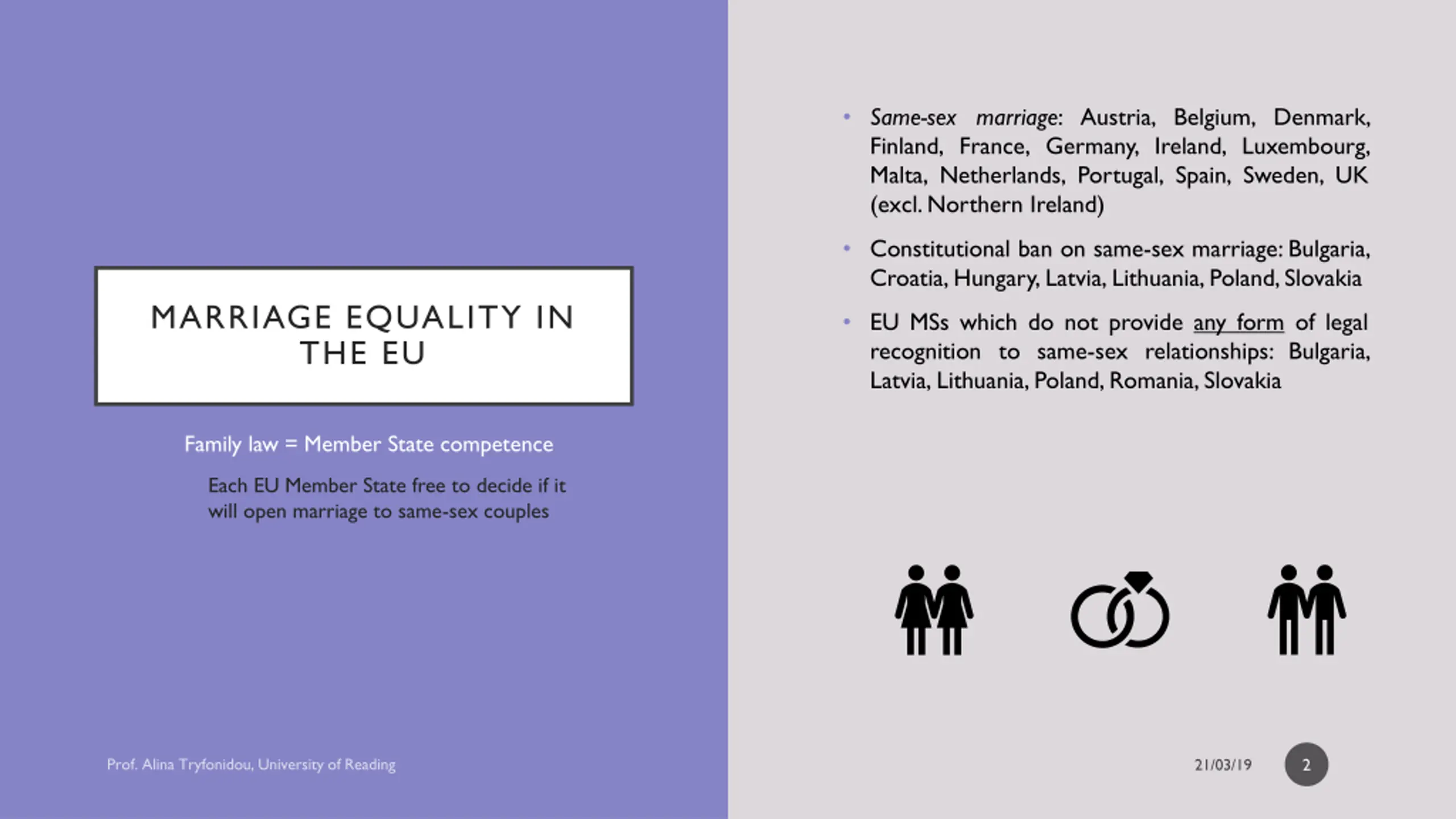 Same-sex marriage: Austria, Belgium, Denmark, Finland, France, Germany, Ireland, Luxembourg, Malta, Netherlands, Portugal, Spain, Sweden, UK (excl. Northern Ireland) Constitutional ban on same-sex marriage: Bulgaria, Croatia, Hungary, Latvia, Lithuania, Poland, Slovakia MARRIAGE EQUALITY IN THE EU EU MSs which do not provide any form of legal recognition to same-sex relationships: Bulgaria, Latvia, Lithuania, Poland, Romania, Slovakia Family law = Member State competence Each EU Member State free to decide if it will open marriage to same-sex couples 2
