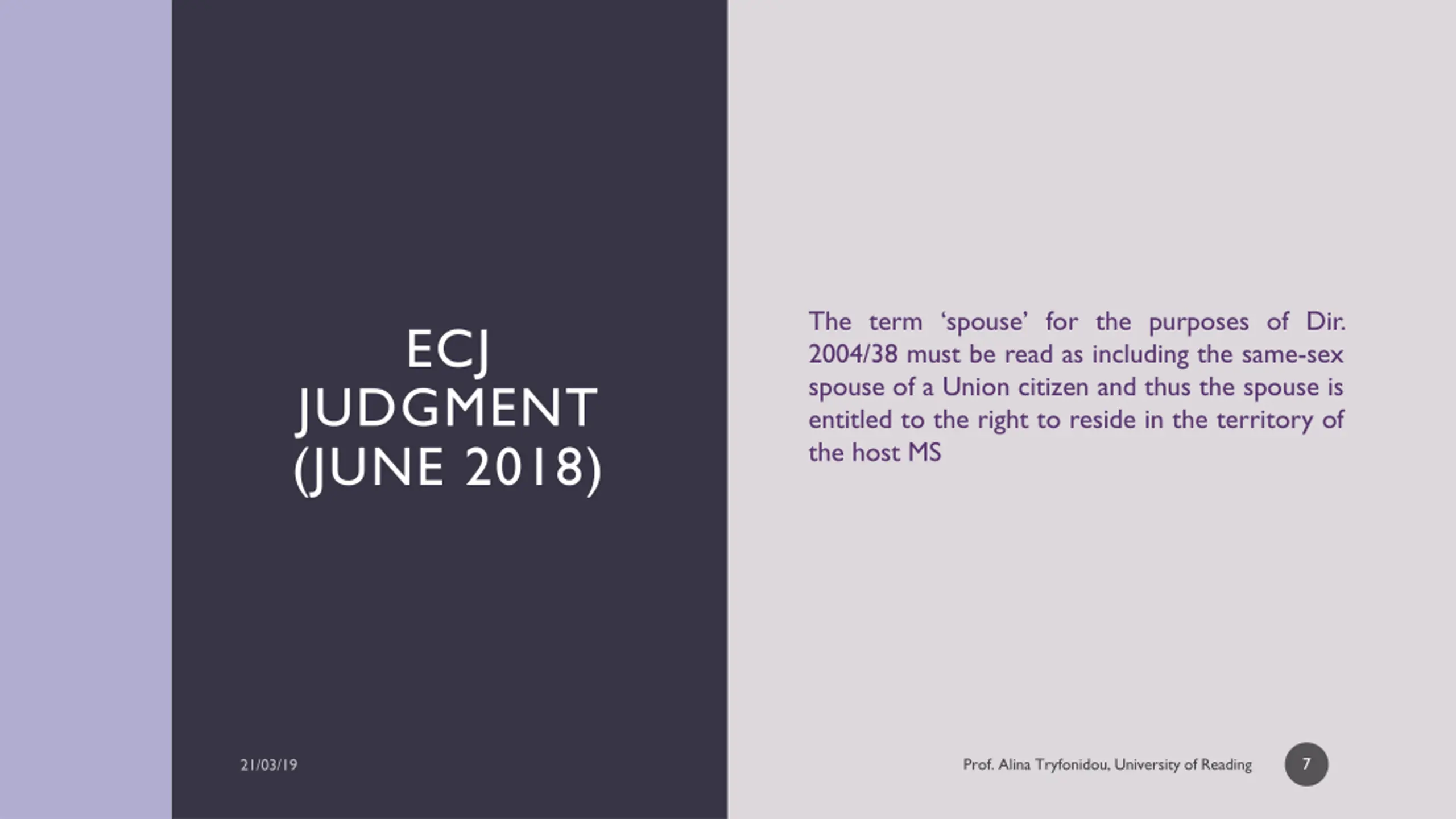 The term spouse for the purposes of Dir. 2004/38 must be read as including the same-sex spouse of a Union citizen and thus the spouse is entitled to the right to reside in the territory of the host MS ECJ JUDGMENT (JUNE 2018) 7