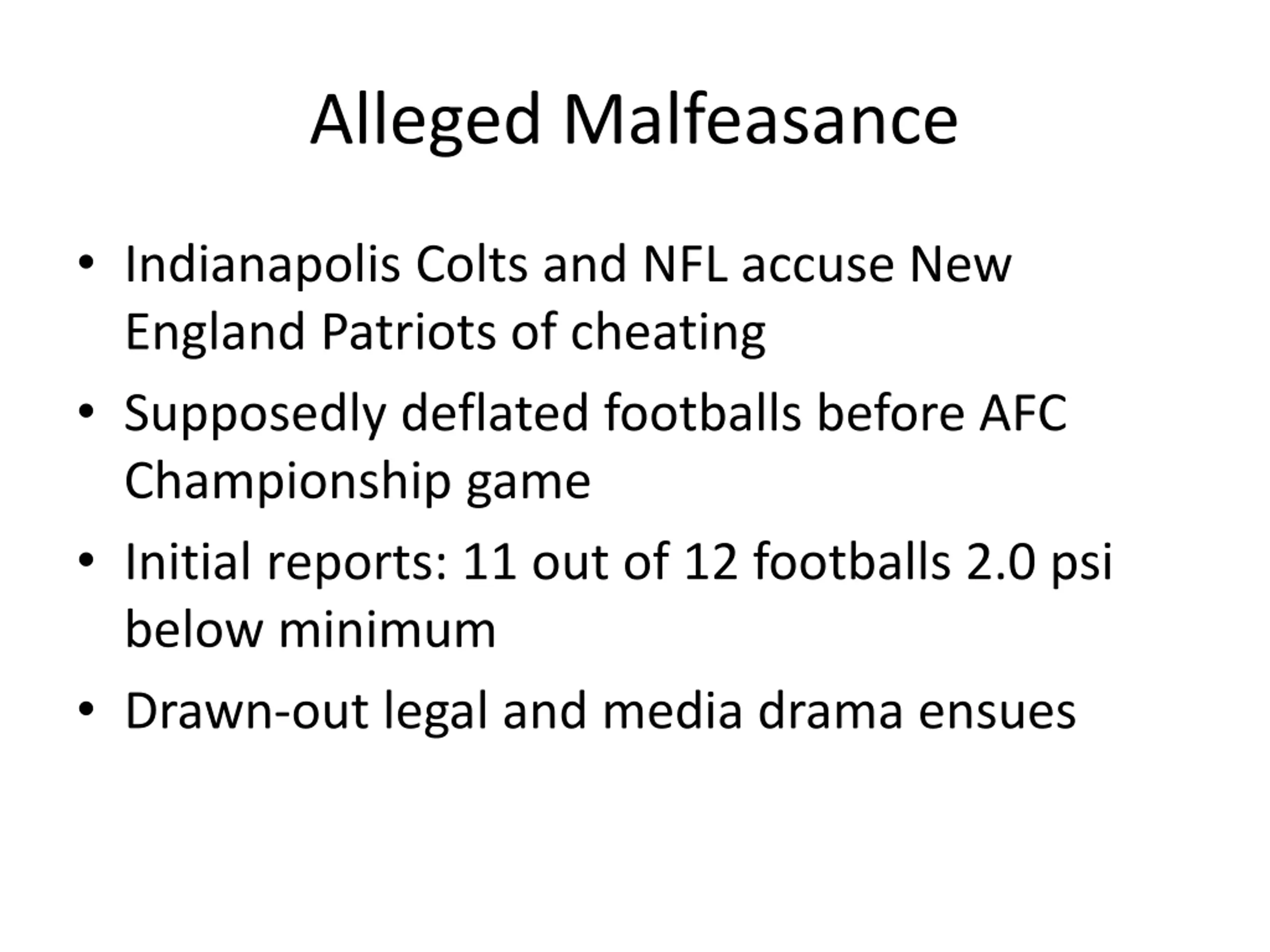 Alleged Malfeasance Indianapolis Colts and NFL accuse New England Patriots of cheating Supposedly deflated footballs before AFC Championship game Initial reports: 11 out of 12 footballs 2.0 psi below minimum Drawn-out legal and media drama ensues