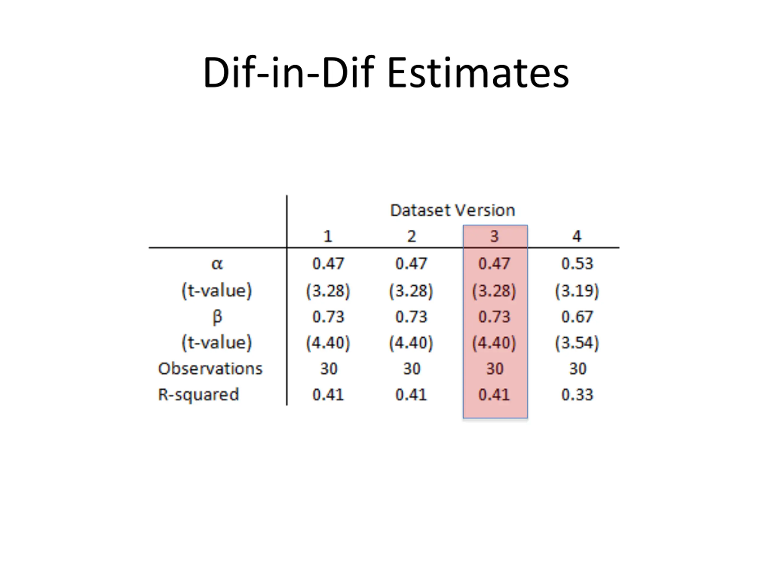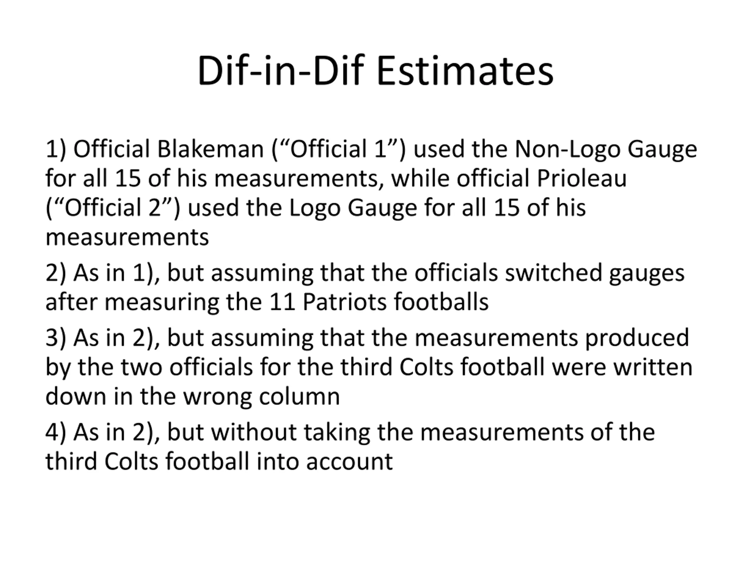 Dif-in-Dif Estimates 1) Official Blakeman ( Official 1 ) used the Non-Logo Gauge for all 15 of his measurements, while official Prioleau ( Official 2 ) used the Logo Gauge for all 15 of his measurements 2) As in 1), but assuming that the officials switched gauges after measuring the 11 Patriots footballs 3) As in 2), but assuming that the measurements produced by the two officials for the third Colts football were written down in the wrong column 4) As in 2), but without taking the measurements of the third Colts football into account