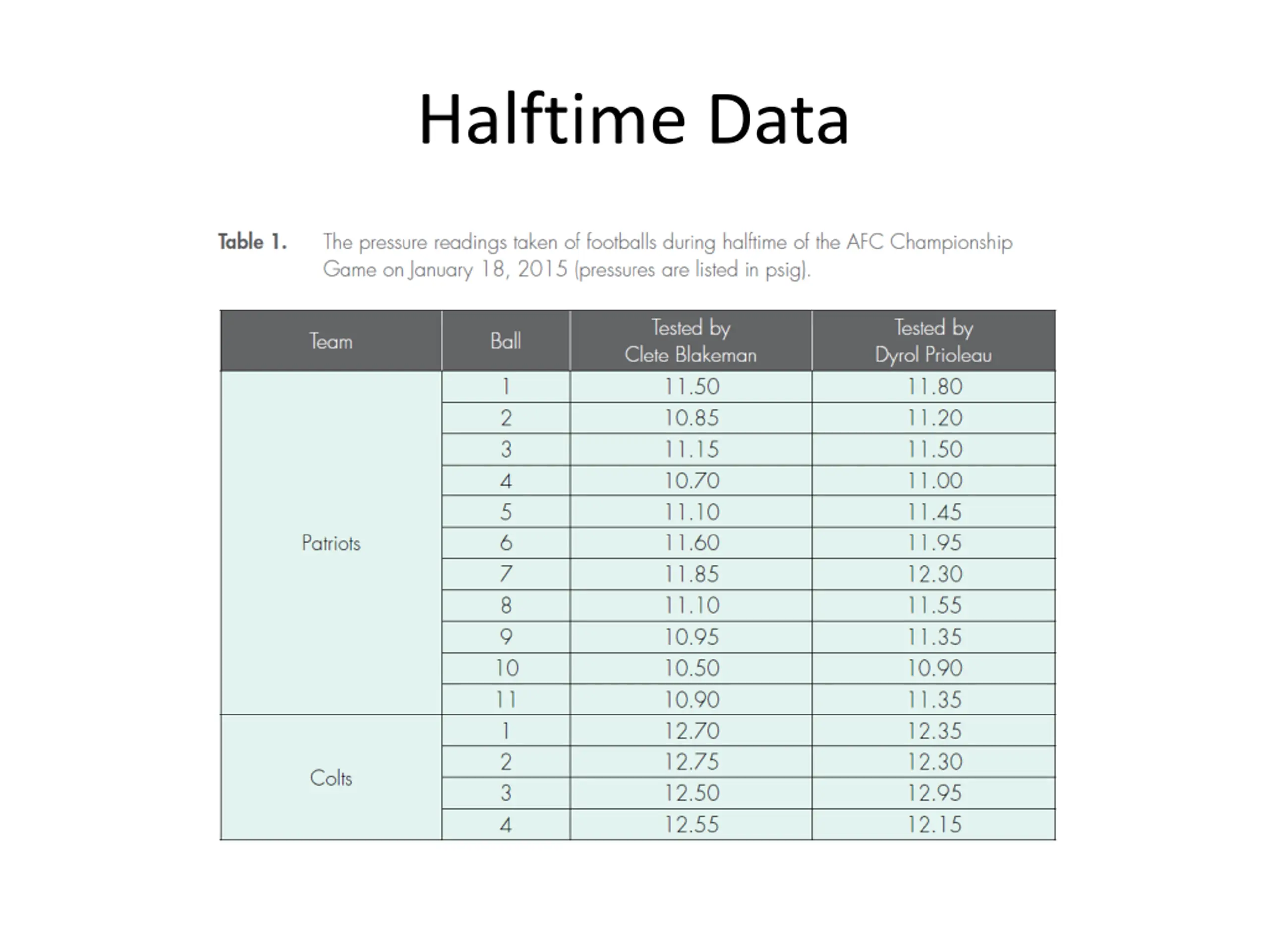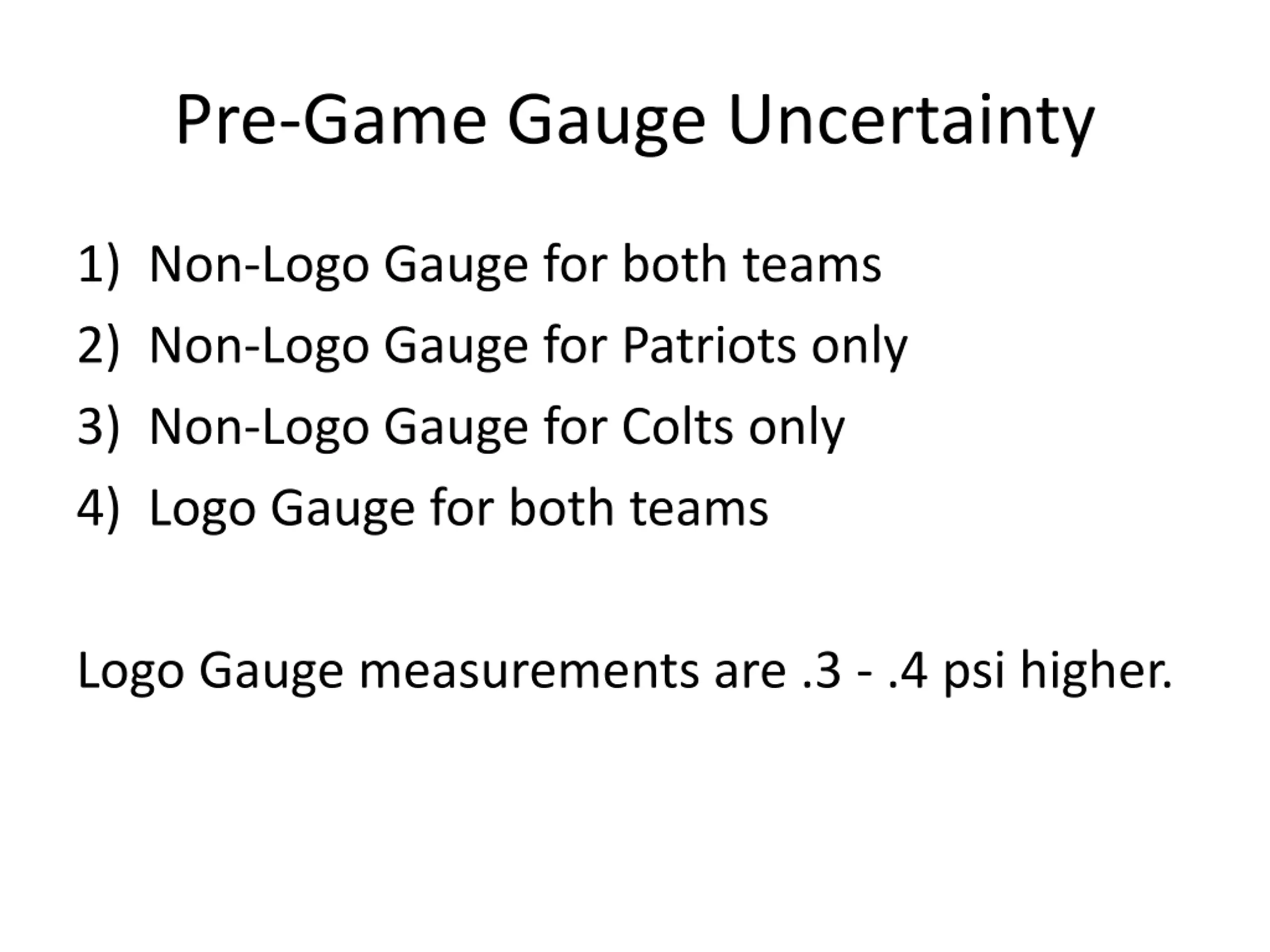 Pre-Game Gauge Uncertainty 1) Non-Logo Gauge for both teams 2) Non-Logo Gauge for Patriots only 3) Non-Logo Gauge for Colts only 4) Logo Gauge for both teams Logo Gauge measurements are .3 - .4 psi higher.