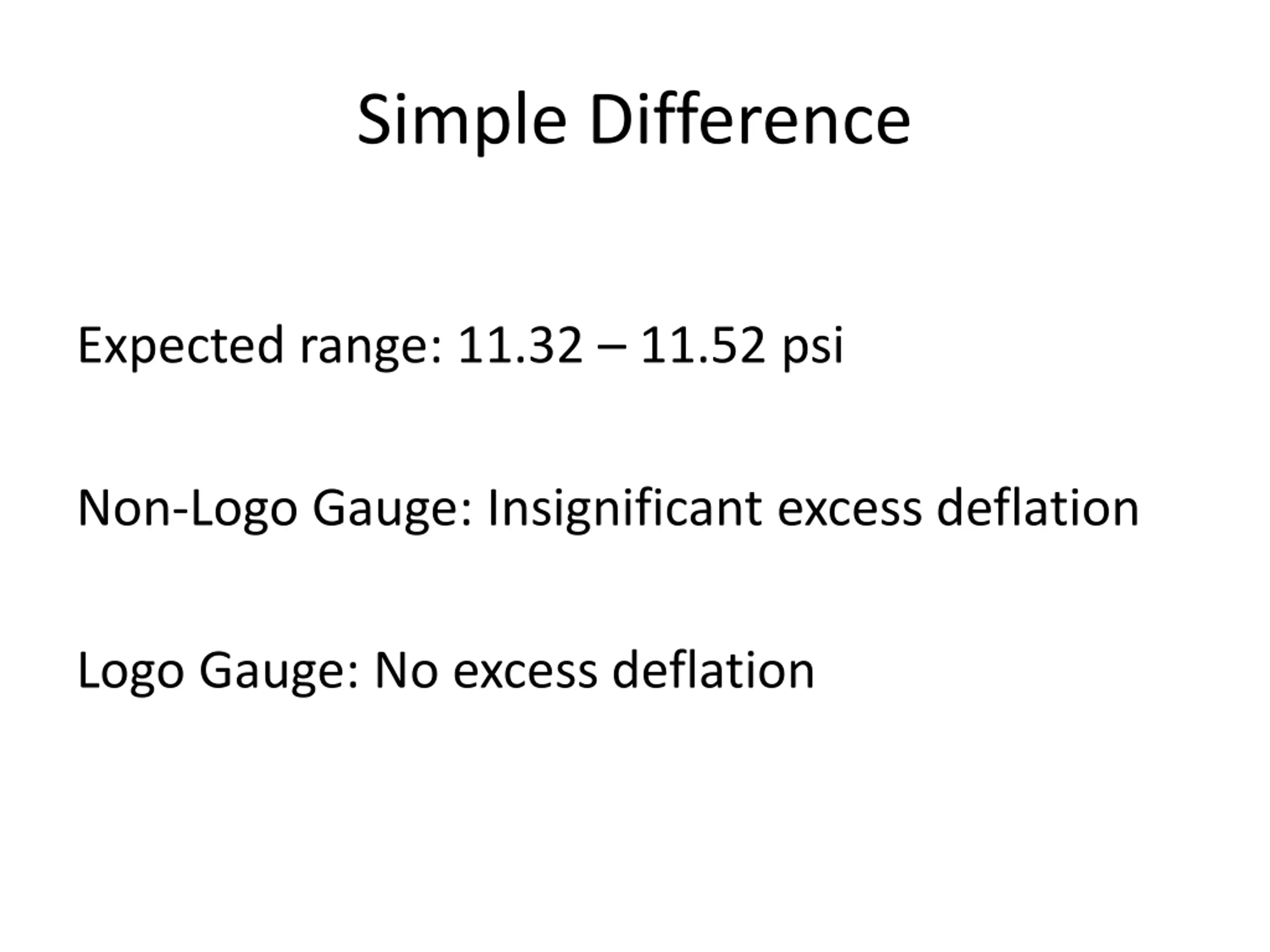 Simple Difference Expected range: 11.32 11.52 psi Non-Logo Gauge: Insignificant excess deflation Logo Gauge: No excess deflation