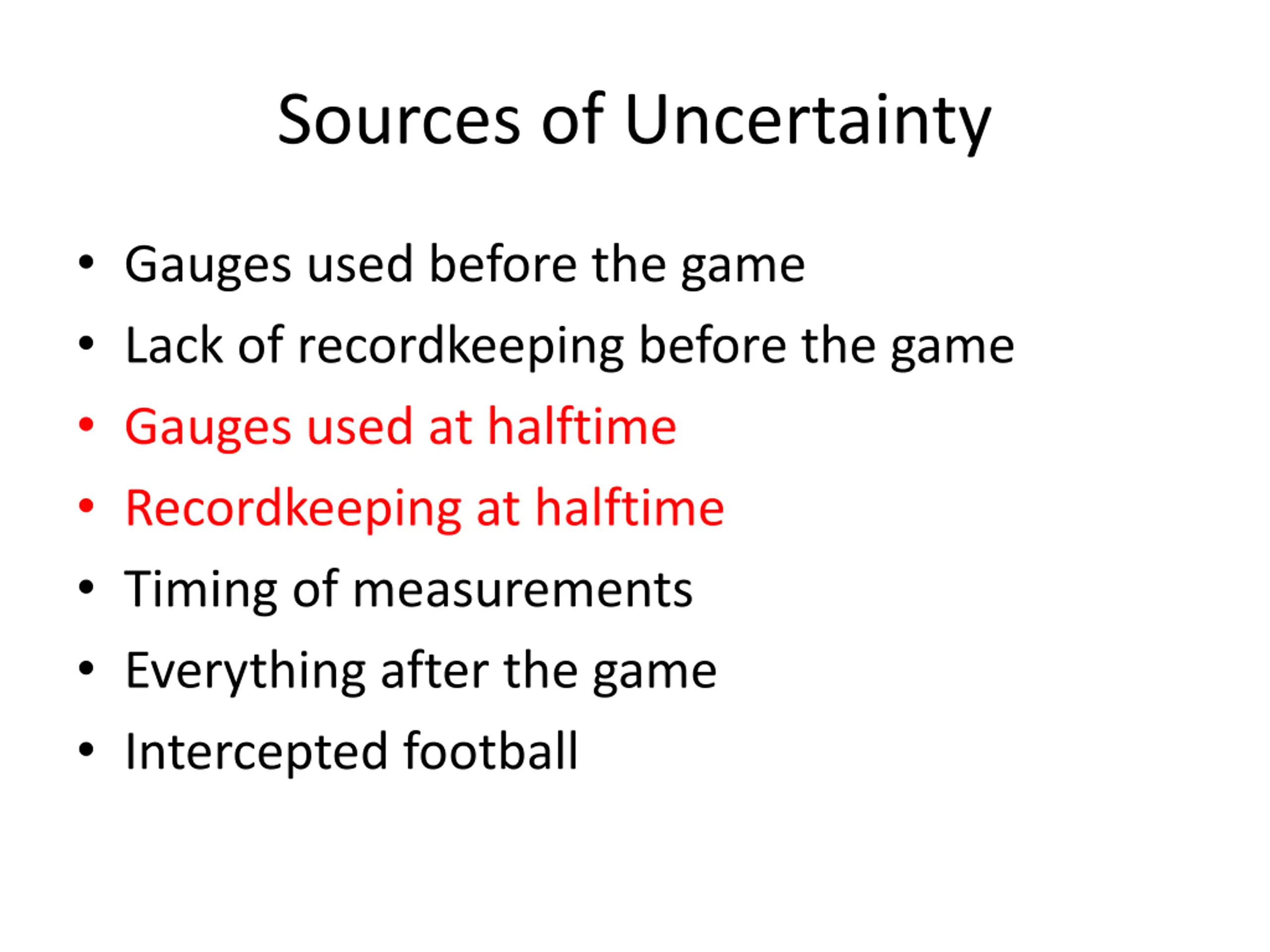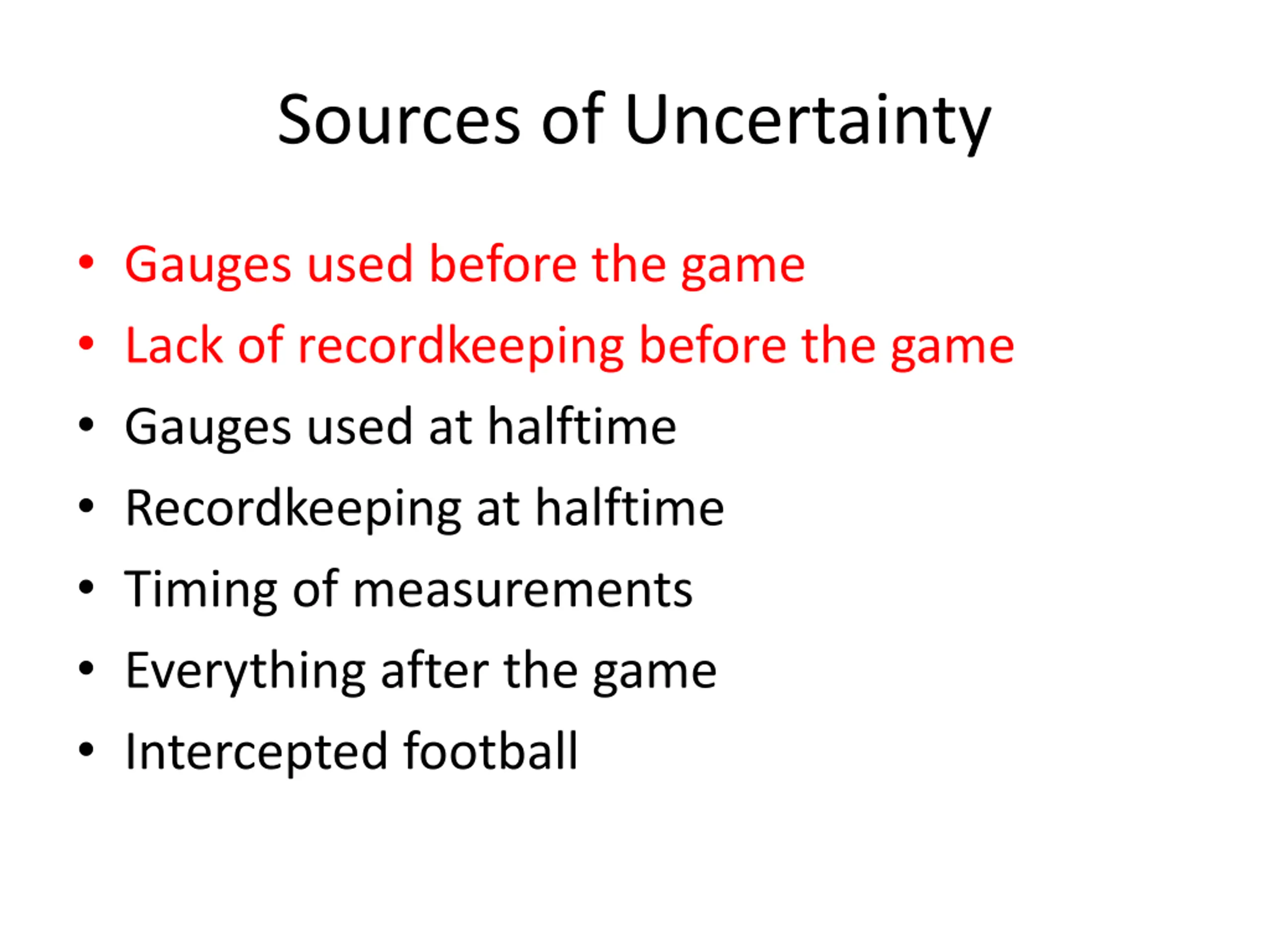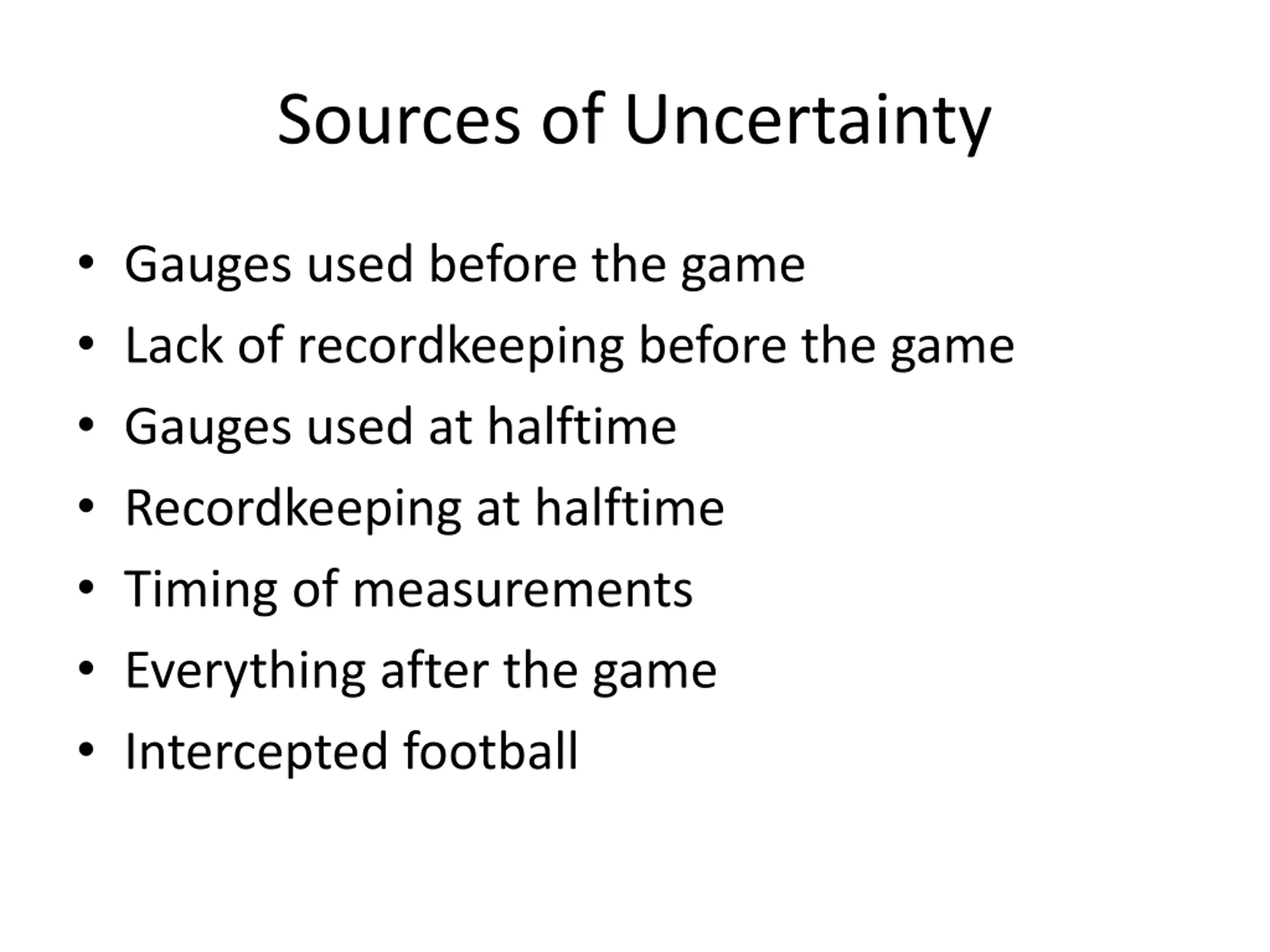 Sources of Uncertainty Gauges used before the game Lack of recordkeeping before the game Gauges used at halftime Recordkeeping at halftime Timing of measurements Everything after the game Intercepted football