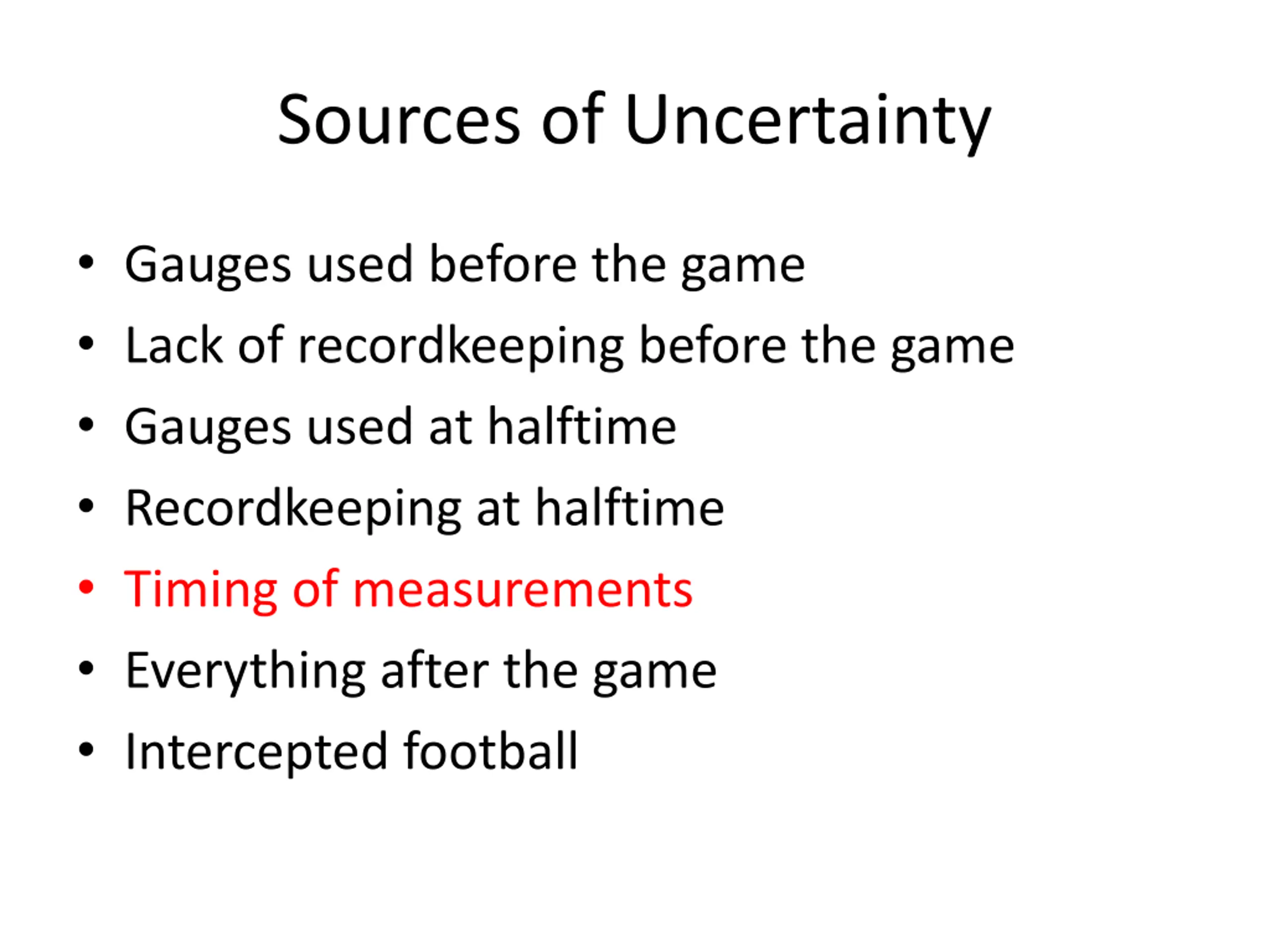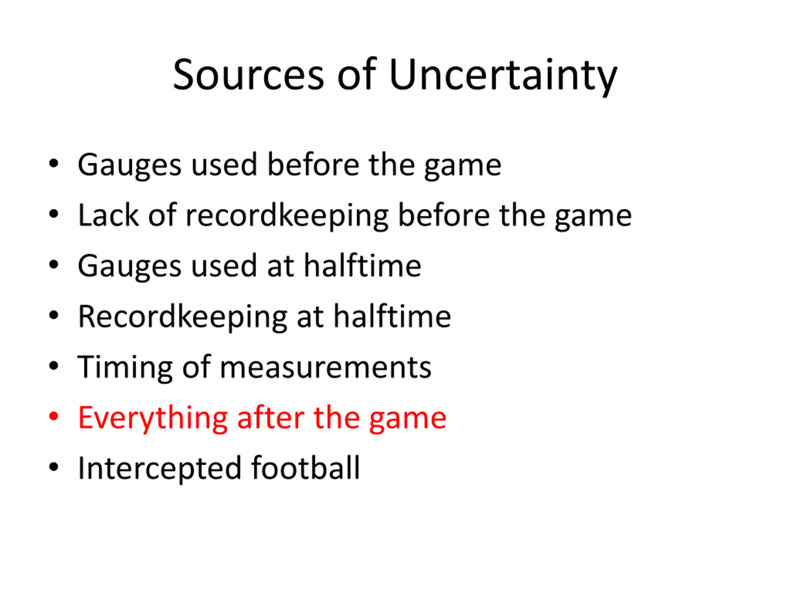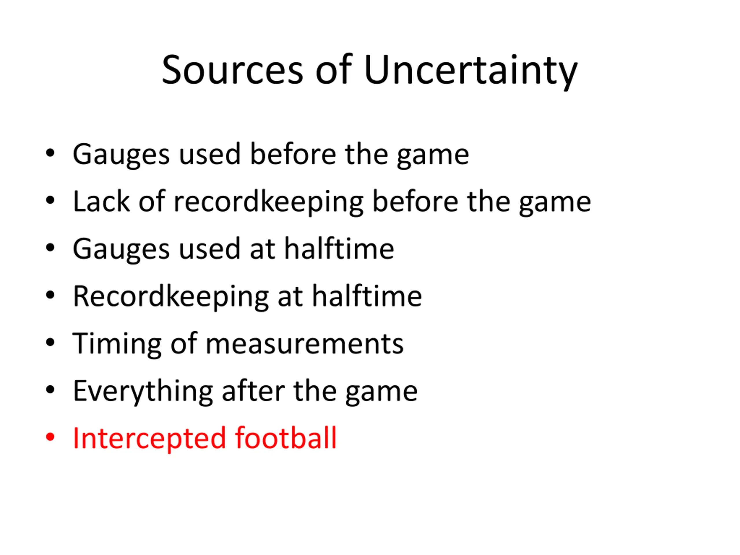 Sources of Uncertainty Gauges used before the game Lack of recordkeeping before the game Gauges used at halftime Recordkeeping at halftime Timing of measurements Everything after the game Intercepted football