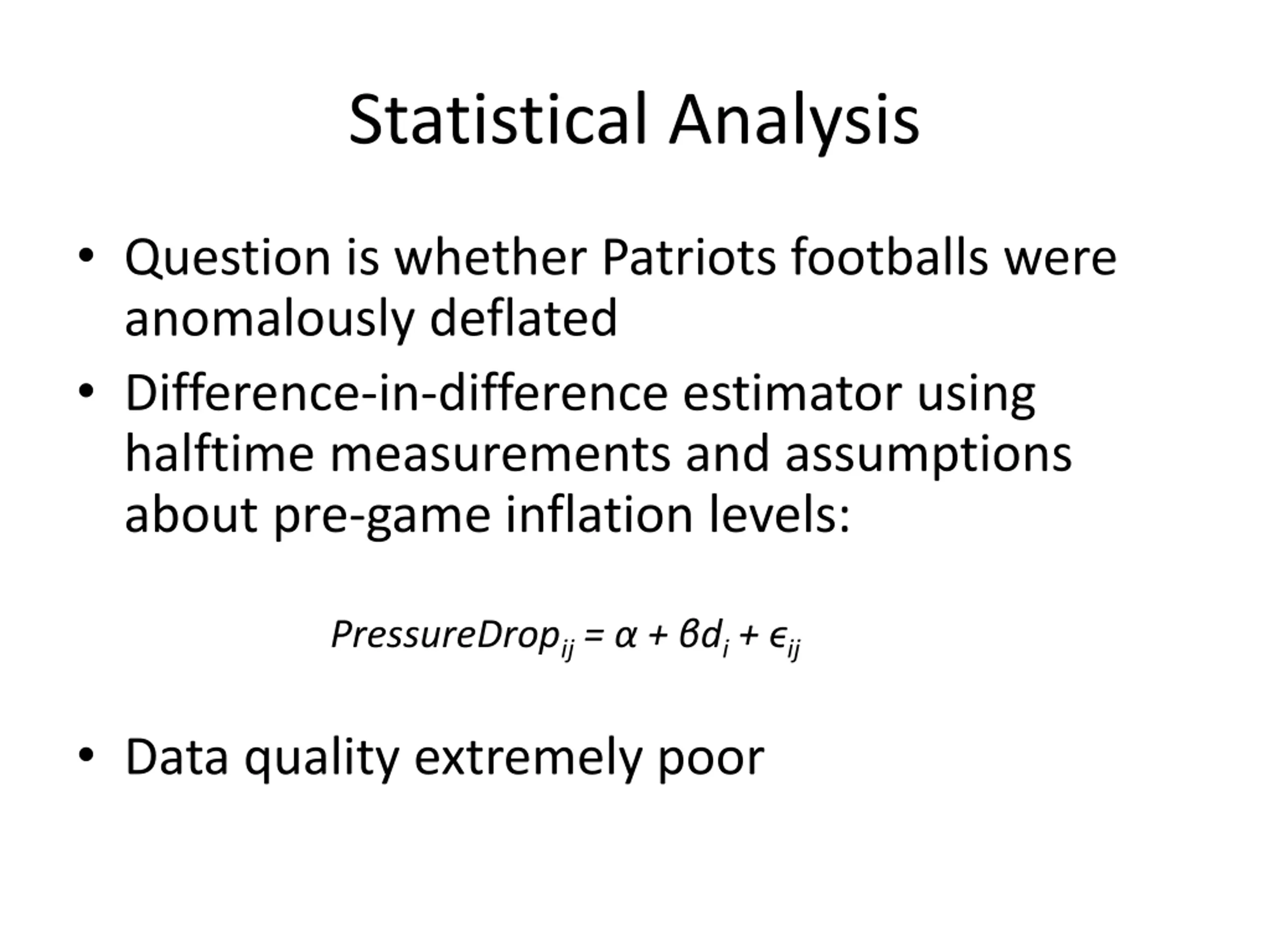 Statistical Analysis Question is whether Patriots footballs were anomalously deflated Difference-in-difference estimator using halftime measurements and assumptions about pre-game inflation levels: PressureDropij= + di+ ij Data quality extremely poor