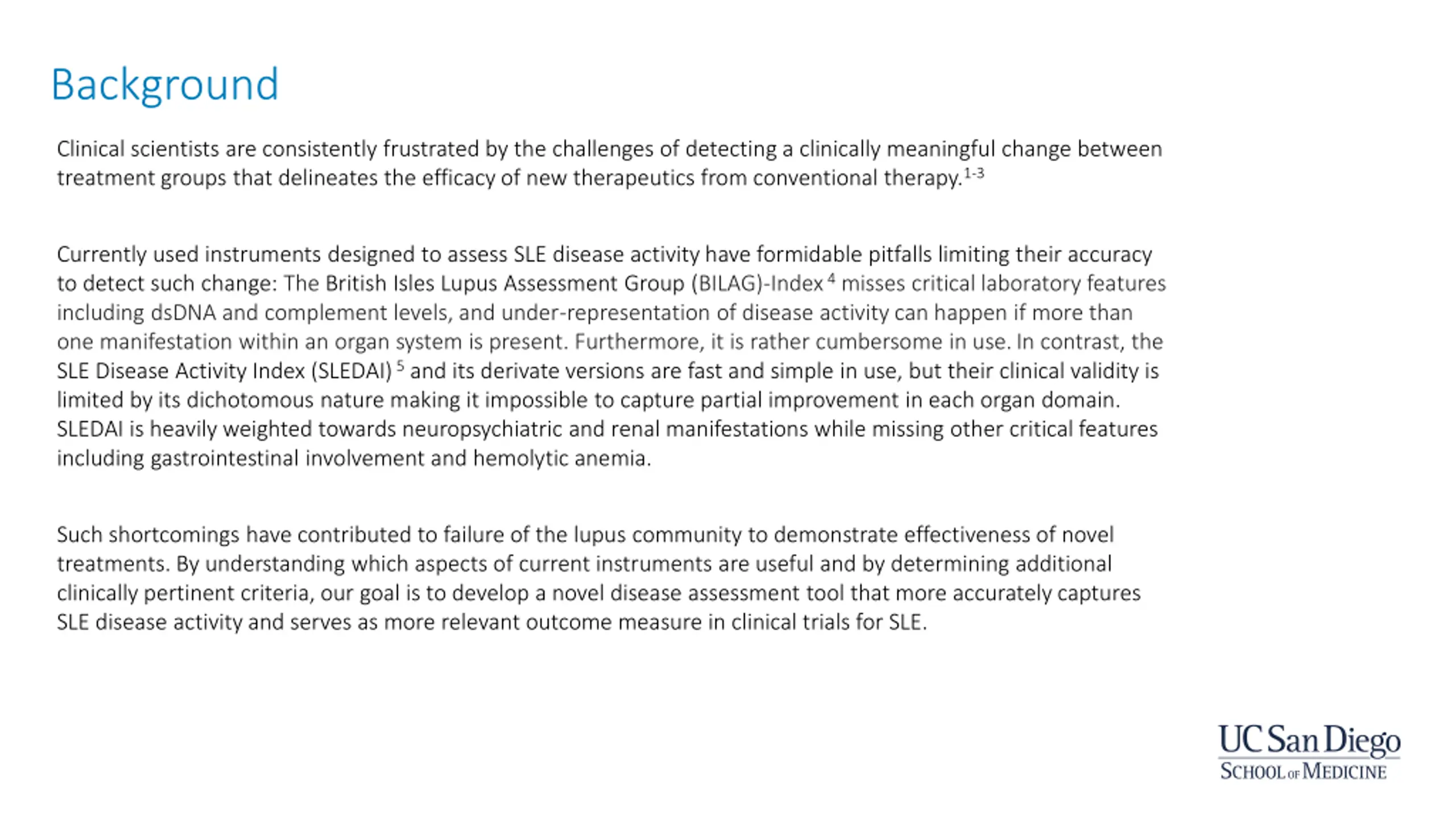 Background Clinical scientists are consistently frustrated by the challenges of detecting a clinically meaningful change between treatment groups that delineates the efficacy of new therapeutics from conventional therapy.1-3 Currently used instruments designed to assess SLE disease activity have formidable pitfalls limiting their accuracy to detect such change: The British Isles Lupus Assessment Group (BILAG)-Index 4 misses critical laboratory features including dsDNA and complement levels, and under-representation of disease activity can happen if more than one manifestation within an organ system is present. Furthermore, it is rather cumbersome in use.In contrast, the SLE Disease Activity Index (SLEDAI) 5 and its derivate versions are fast and simple in use, but their clinical validity is limited by its dichotomous nature making it impossible to capture partial improvement in each organ domain. SLEDAI is heavily weighted towards neuropsychiatric and renal manifestations while missing other critical features including gastrointestinal involvement and hemolytic anemia. Such shortcomings have contributed to failure of the lupus community to demonstrate effectiveness of novel treatments. By understanding which aspects of current instruments are useful and by determining additional clinically pertinent criteria, our goal is to develop a novel disease assessment tool that more accurately captures SLE disease activity and serves as more relevant outcome measure in clinical trials for SLE.