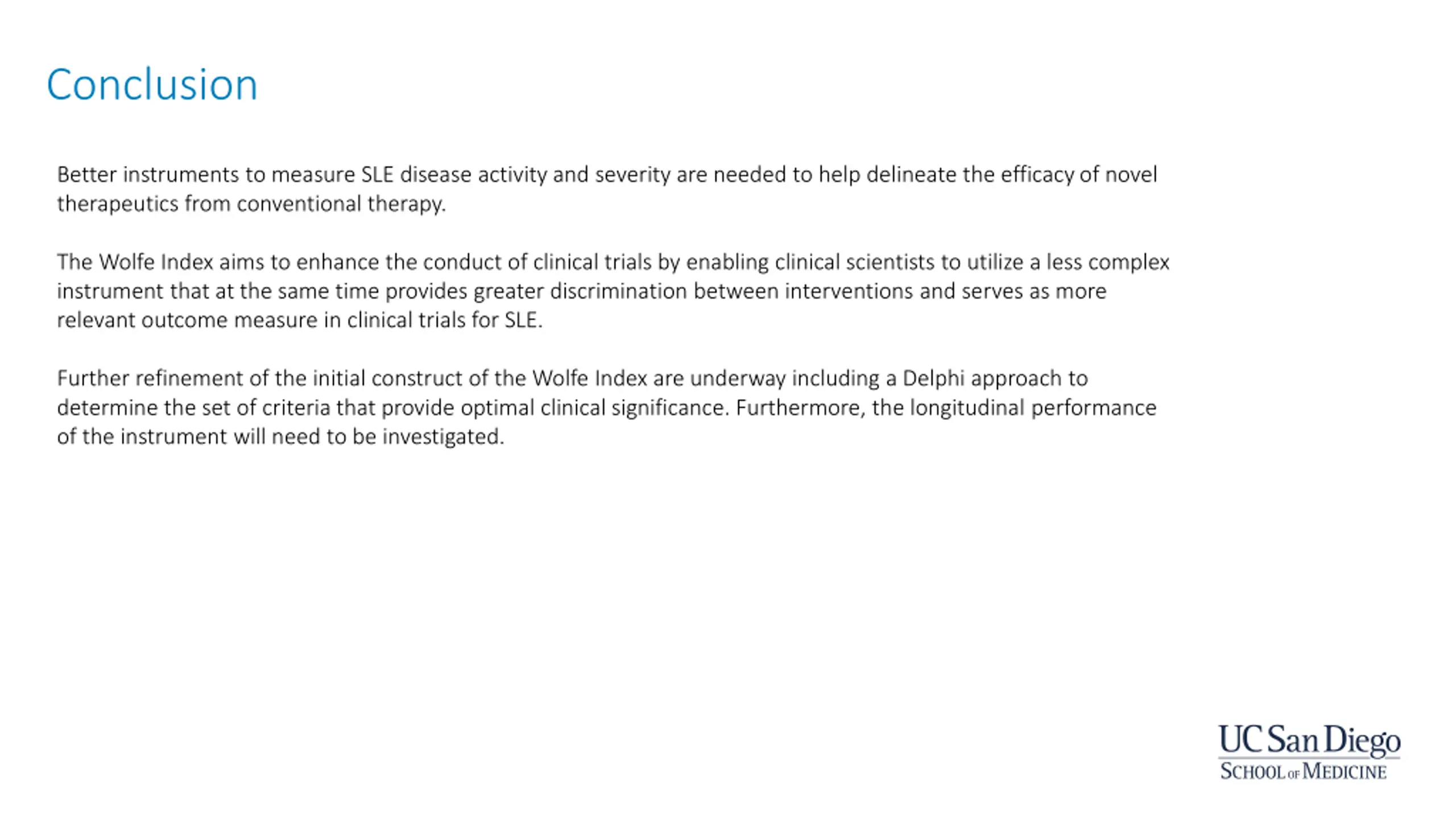 Conclusion Better instruments to measure SLE disease activity and severity are needed to help delineate the efficacy of novel therapeutics from conventional therapy. The Wolfe Index aims to enhance the conduct of clinical trials by enabling clinical scientists to utilize a less complex instrument that at the same time provides greater discrimination between interventions and serves as more relevant outcome measure in clinical trials for SLE. Further refinement of the initial construct of the Wolfe Index are underway including a Delphi approach to determine the set of criteria that provide optimal clinical significance. Furthermore, the longitudinal performance of the instrument will need to be investigated.