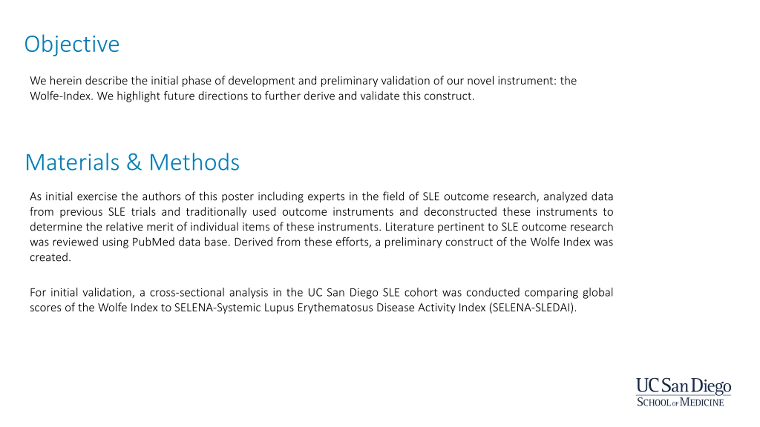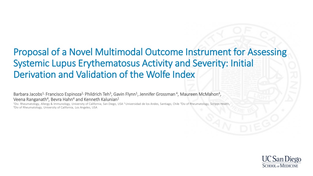 Proposal of a Novel Multimodal Outcome Instrument for Assessing Proposal of a Novel Multimodal Outcome Instrument for Assessing Systemic Lupus Erythematosus Activity and Severity: Initial Systemic Lupus Erythematosus Activity and Severity: Initial Derivation and Validation of the Wolfe Index Derivation and Validation of the Wolfe Index Barbara Jacobs Barbara Jacobs1, 1,Francisco Espinoza Francisco Espinoza2, 2,Phildrich Teh Veena Ranganath Veena Ranganath4 4, Bevra Hahn , Bevra Hahn4 4and Kenneth Kalunian 1Div. Rheumatology, Allergy & Immunology, University of California, San Diego, USA 2 Universidad de los Andes, Santiago, Chile 3Div of Rheumatology, Scripps Health, 4Div of Rheumatology, University of California, Los Angeles, USA Phildrich Teh3 3, Gavin Flynn and Kenneth Kalunian1 1 , Gavin Flynn1 1, Jennifer Grossman , Jennifer Grossman4 4, Maureen McMahon , Maureen McMahon4 4, ,