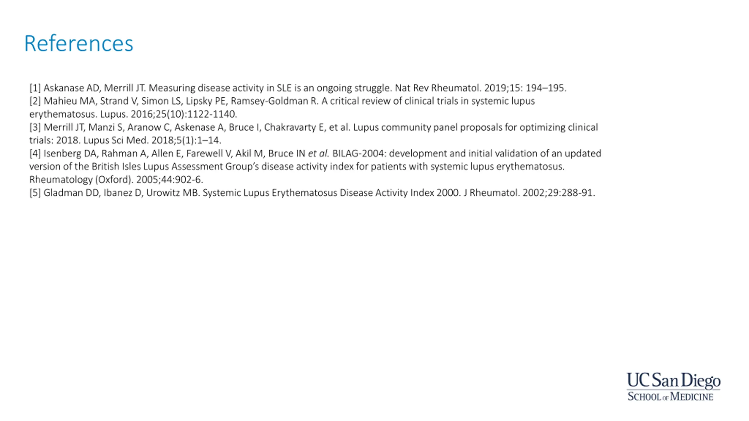 References [1] Askanase AD, Merrill JT. Measuring disease activity in SLE is an ongoing struggle. Nat Rev Rheumatol. 2019;15: 194 195. [2] Mahieu MA, Strand V, Simon LS, Lipsky PE, Ramsey-Goldman R. A critical review of clinical trials in systemic lupus erythematosus. Lupus. 2016;25(10):1122-1140. [3] Merrill JT, Manzi S, Aranow C, Askenase A, Bruce I, Chakravarty E, et al. Lupus community panel proposals for optimizing clinical trials: 2018. Lupus Sci Med. 2018;5(1):1 14. [4] Isenberg DA, Rahman A, Allen E, Farewell V, Akil M, Bruce IN et al. BILAG-2004: development and initial validation of an updated version of the British Isles Lupus Assessment Group s disease activity index for patients with systemic lupus erythematosus. Rheumatology (Oxford). 2005;44:902-6. [5] Gladman DD, Ibanez D, Urowitz MB. Systemic Lupus Erythematosus Disease Activity Index 2000. J Rheumatol. 2002;29:288-91.