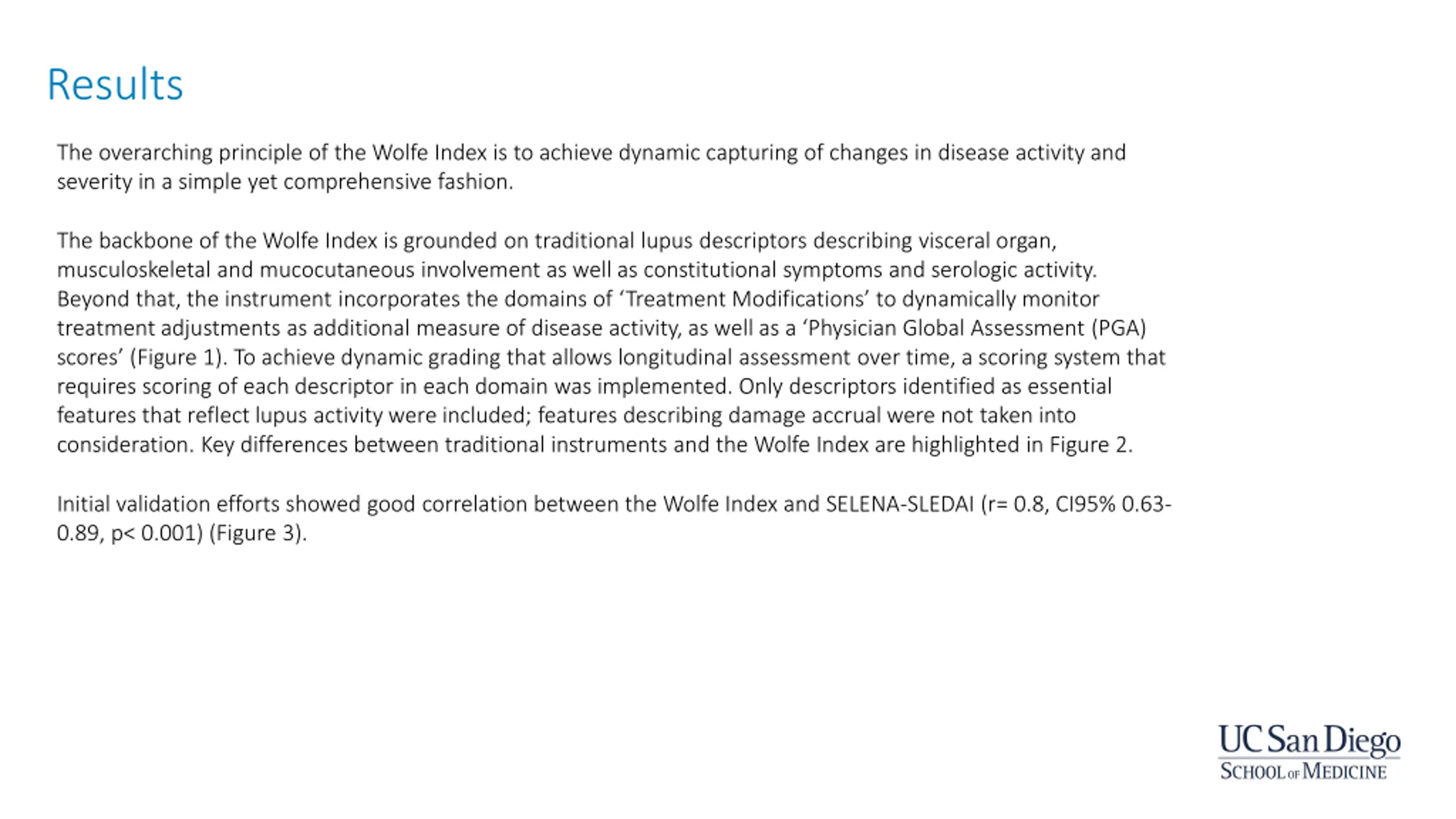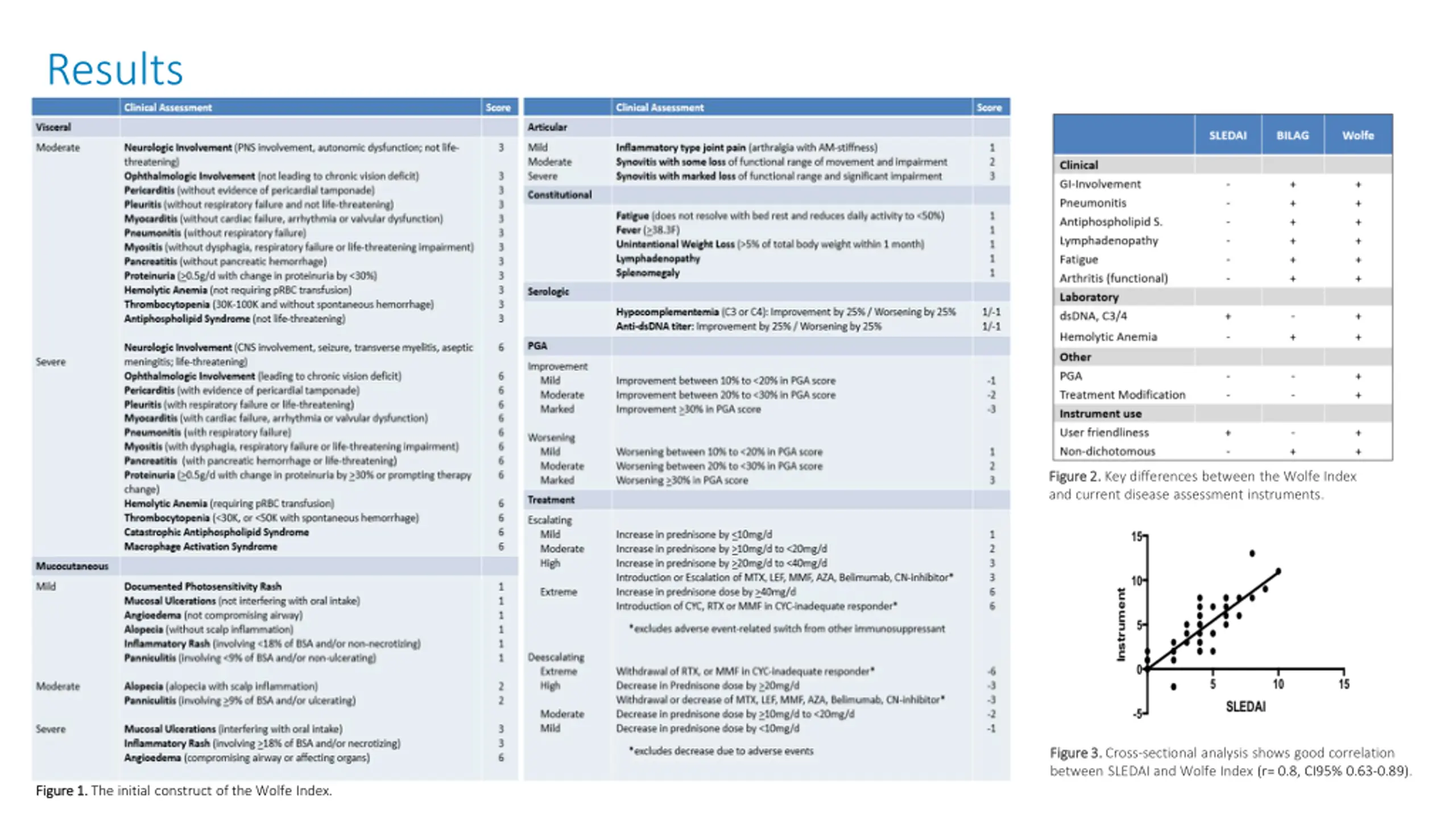 Results Figure 2 Figure 2. . Key differences between the Wolfe Index and current disease assessment instruments. Figure 3. Figure 3. Cross-sectional analysis shows good correlation between SLEDAI and Wolfe Index (r= 0.8, CI95% 0.63-0.89). Figure 1. Figure 1. The initial construct of the Wolfe Index.