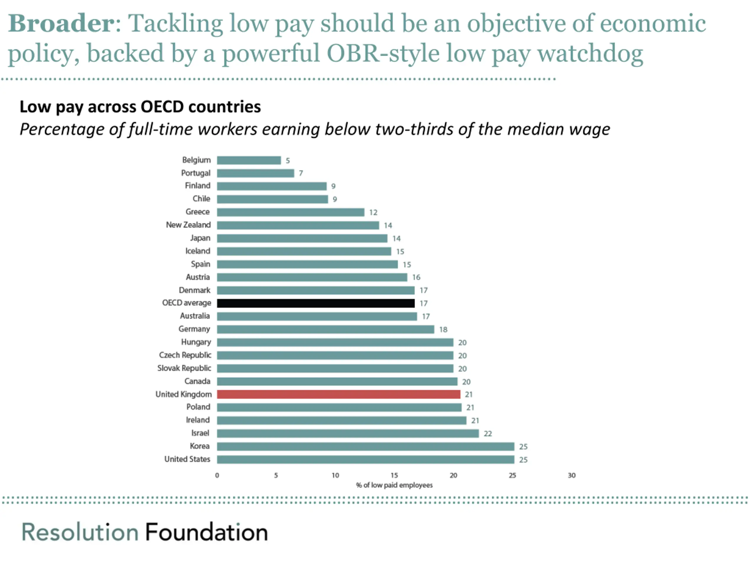 Broader: Tackling low pay should be an objective of economic policy, backed by a powerful OBR-style low pay watchdog .. Low pay across OECD countries Percentage of full-time workers earning below two-thirds of the median wage