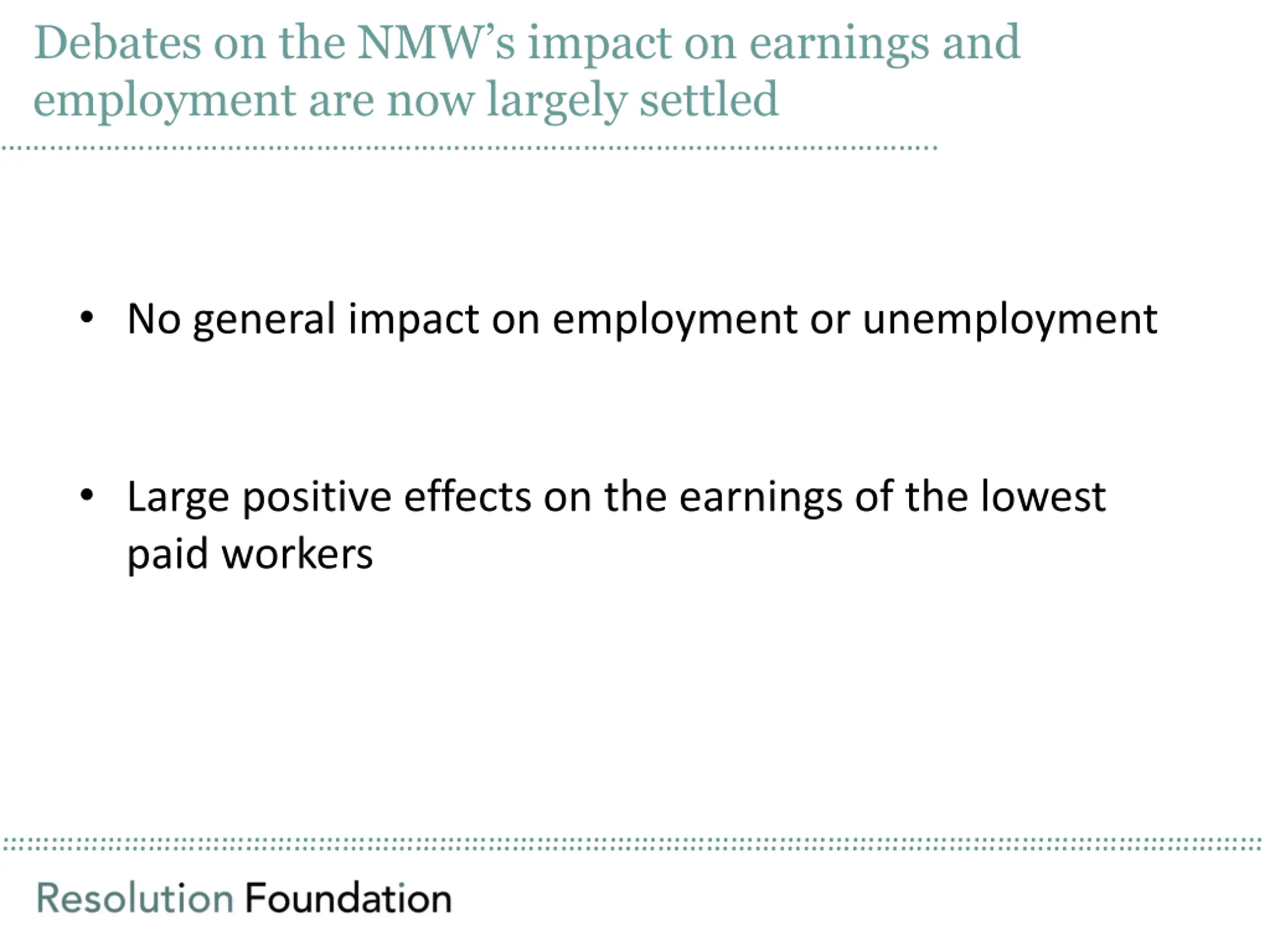 Debates on the NMWs impact on earnings and employment are now largely settled .. No general impact on employment or unemployment Large positive effects on the earnings of the lowest paid workers