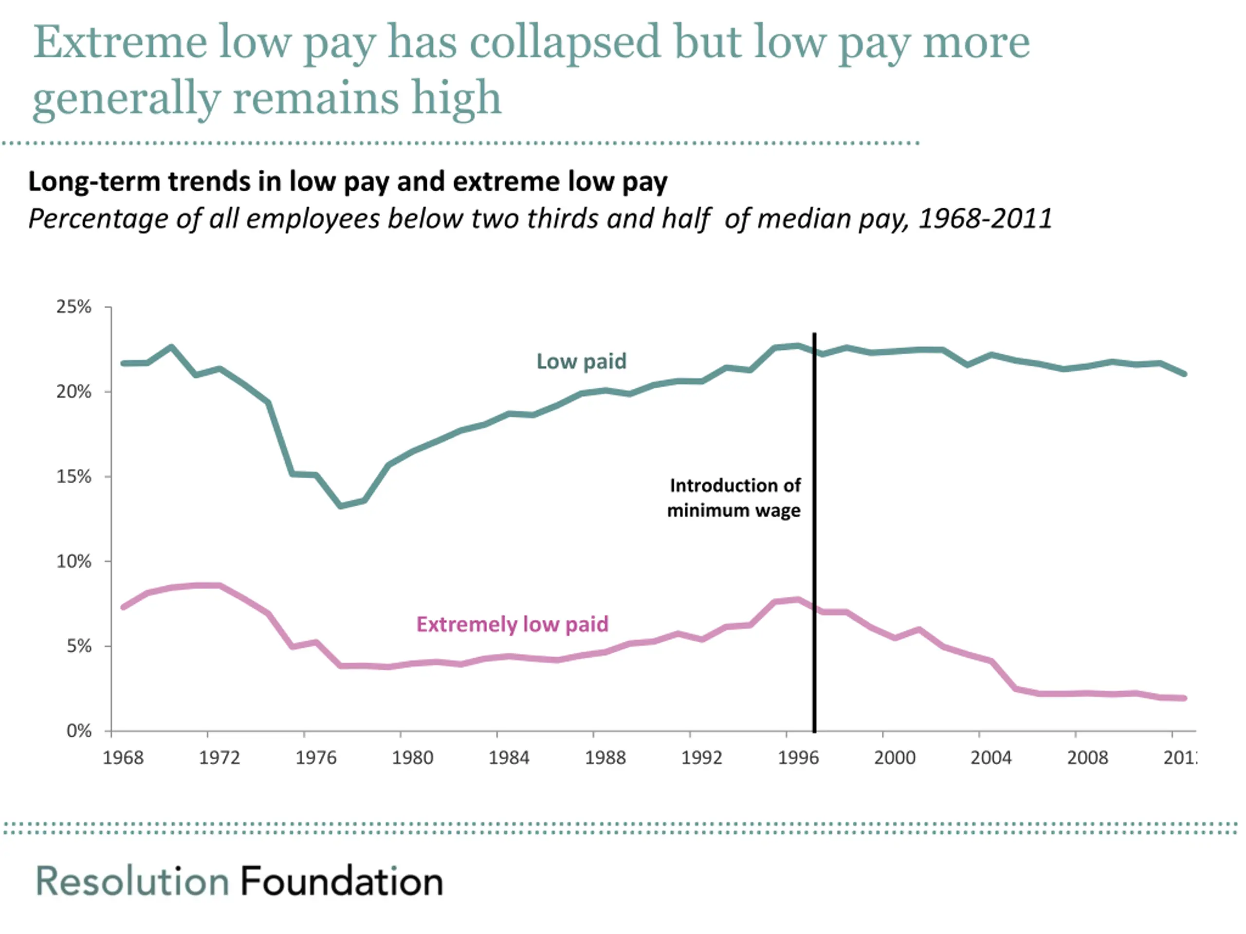 Extreme low pay has collapsed but low pay more generally remains high .. Long-term trends in low pay and extreme low pay Percentage of all employees below two thirds and half of median pay, 1968-2011 25% Low paid 20% 15% Introduction of minimum wage 10% Extremely low paid 5% 0% 1968 1972 1976 1980 1984 1988 1992 1996 2000 2004 2008 2012
