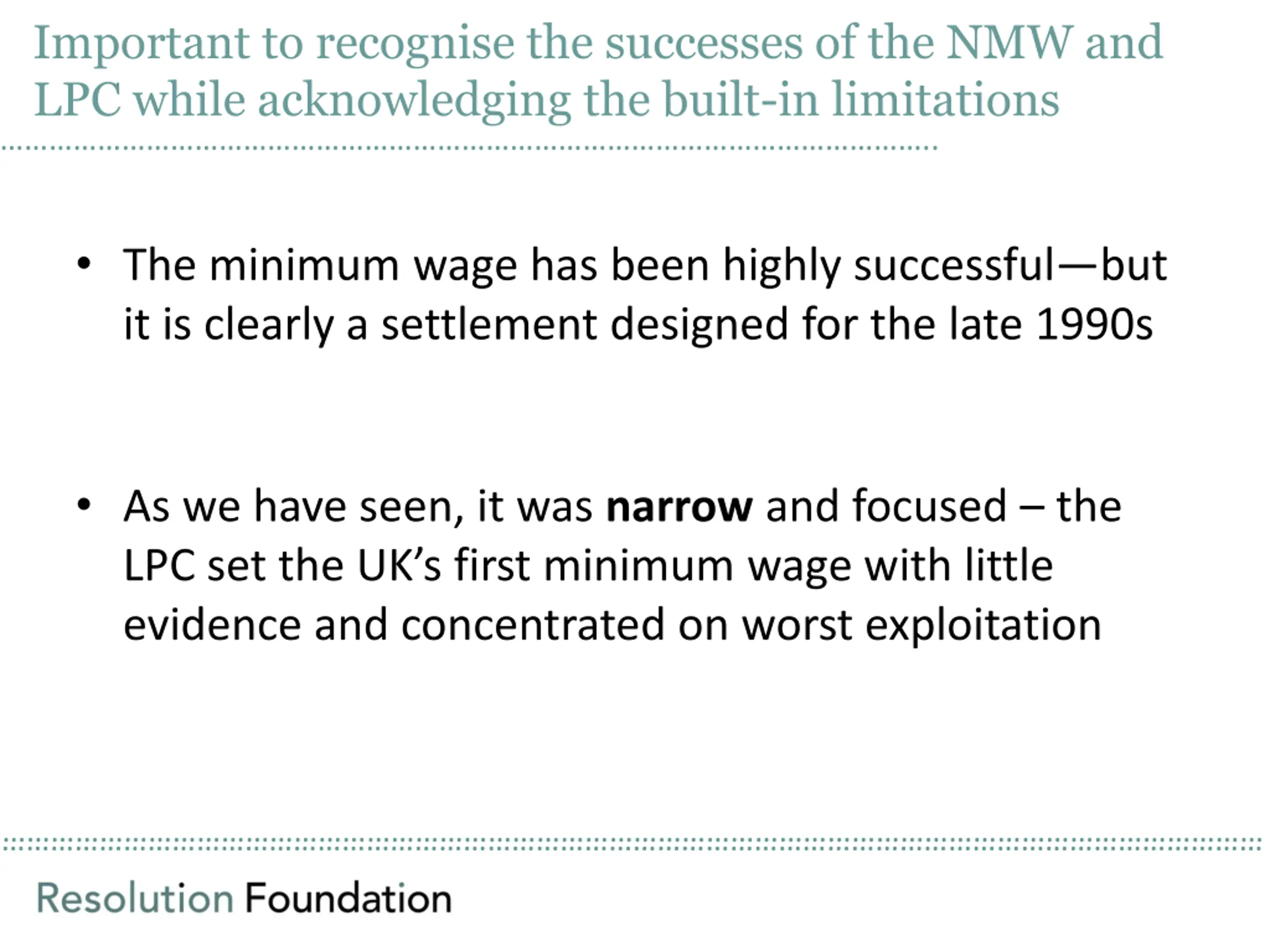 Important to recognise the successes of the NMW and LPC while acknowledging the built-in limitations .. The minimum wage has been highly successful but it is clearly a settlement designed for the late 1990s As we have seen, it was narrow and focused the LPCset the UK s first minimum wage with little evidence and concentrated on worst exploitation