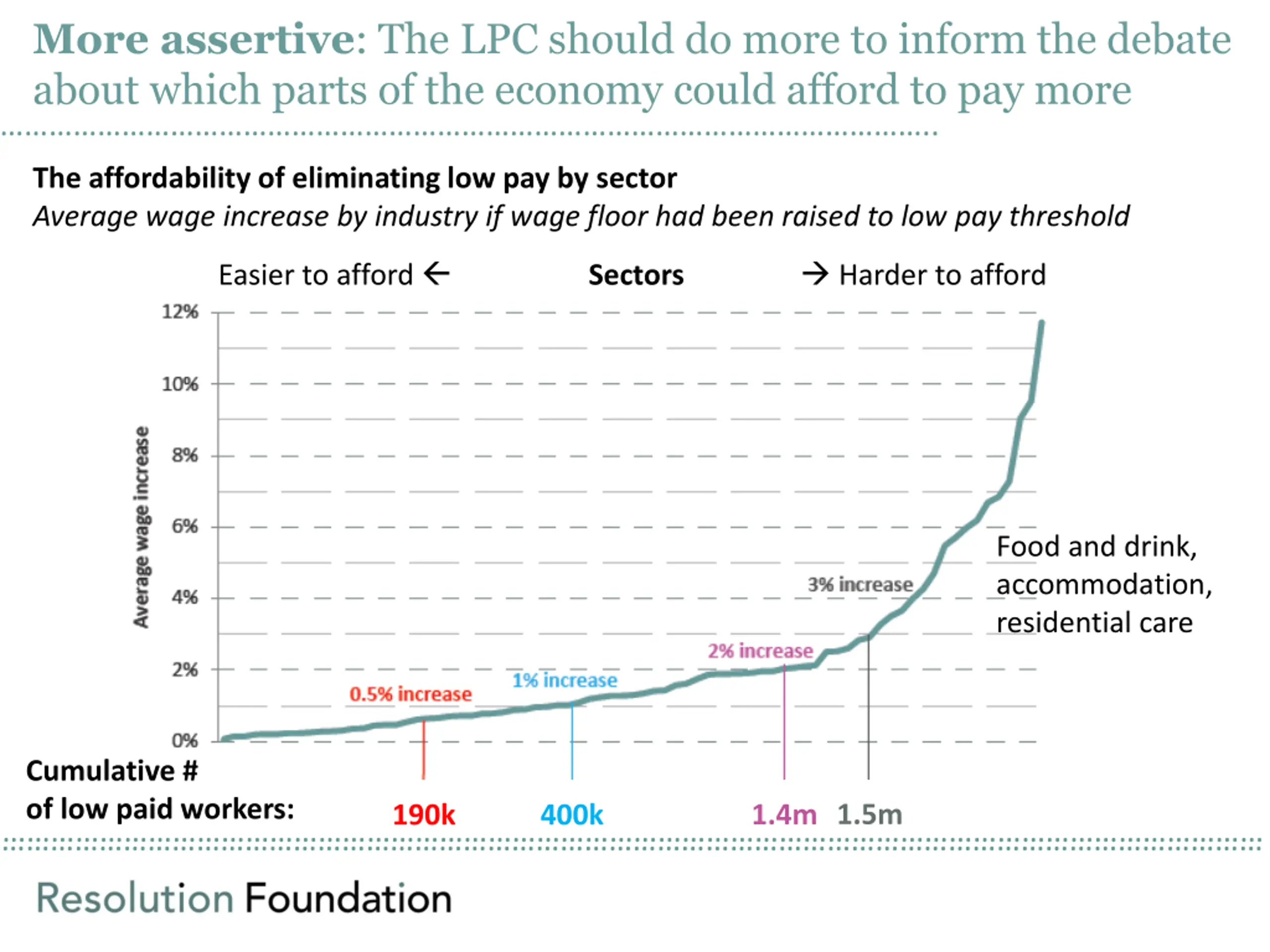 More assertive: The LPC should do more to inform the debate about which parts of the economy could afford to pay more .. The affordability of eliminating low pay by sector Average wage increase by industry if wage floor had been raised to low pay threshold Easier to afford Harder to afford Sectors Food and drink, accommodation, residential care Cumulative # of low paid workers: 1.5m 1.4m 400k 190k