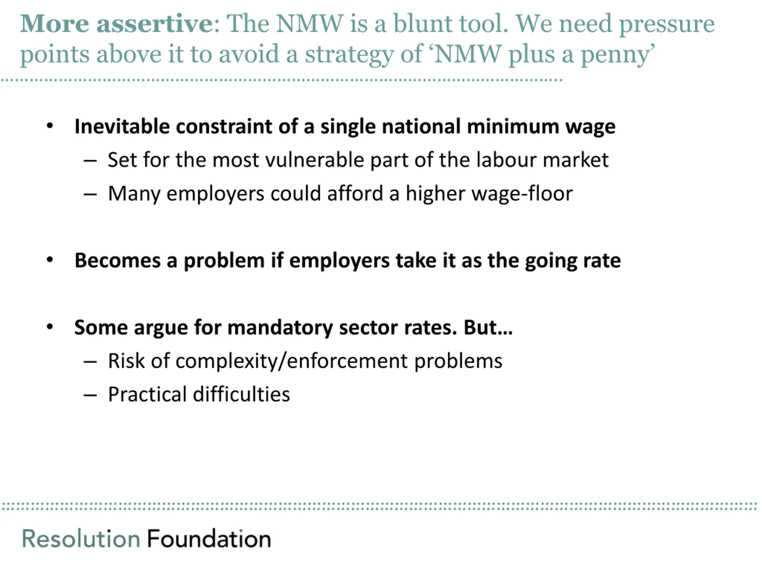 More assertive: The NMW is a blunt tool. We need pressure points above it to avoid a strategy of NMW plus a penny .. Inevitable constraint of a single national minimum wage Set for the most vulnerable part of the labour market Many employers could afford a higher wage-floor Becomes a problem if employers take it as the going rate Some argue for mandatory sector rates. But Risk of complexity/enforcement problems Practical difficulties