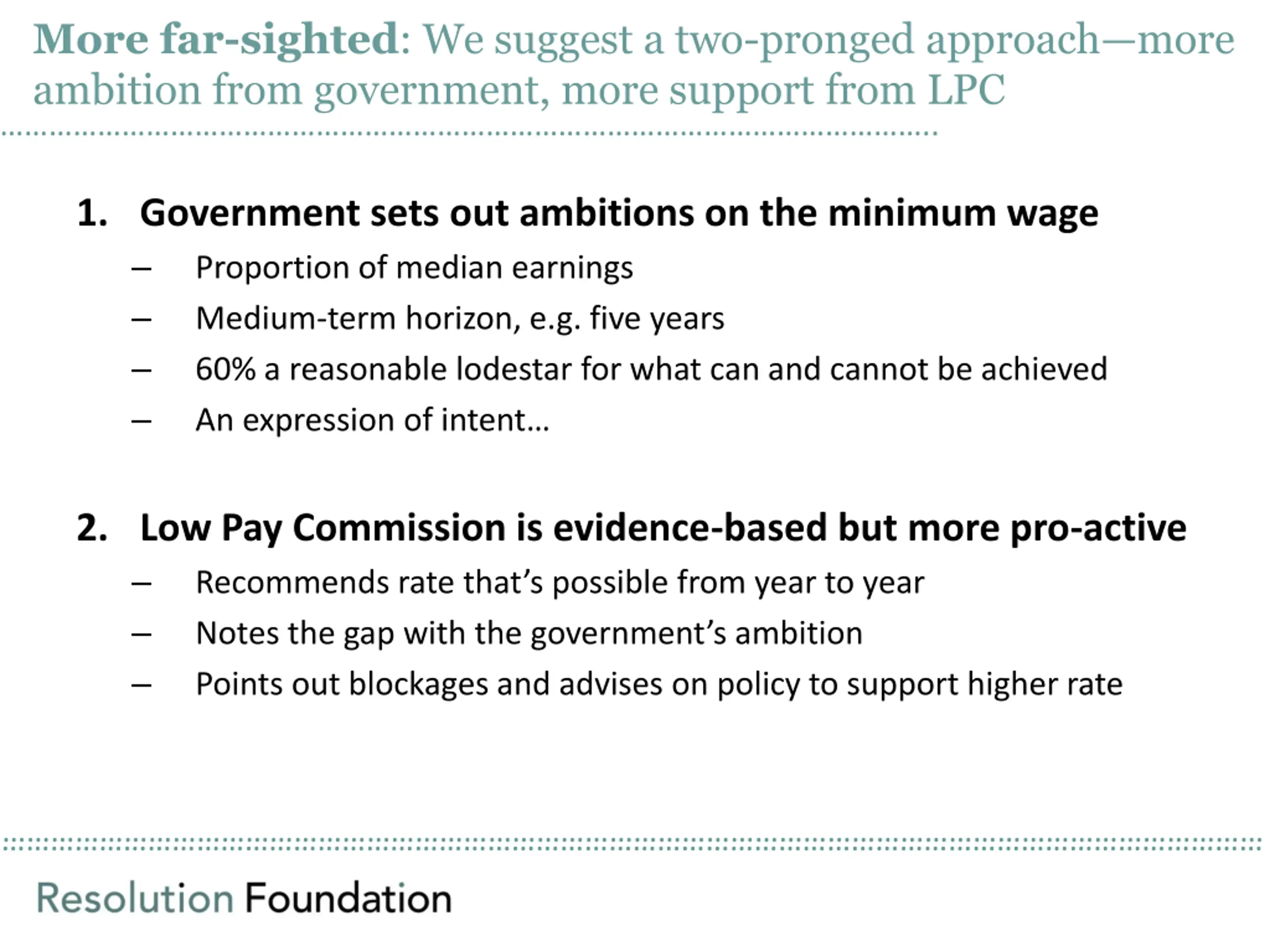 More far-sighted: We suggest a two-pronged approachmore ambition from government, more support from LPC .. 1. Government sets out ambitions on the minimum wage Proportion of median earnings Medium-term horizon, e.g. five years 60% a reasonable lodestar for what can and cannot be achieved An expression of intent 2. Low Pay Commission is evidence-based but more pro-active Recommends rate that s possible from year to year Notes the gap with the government s ambition Points out blockages and advises on policy to support higher rate