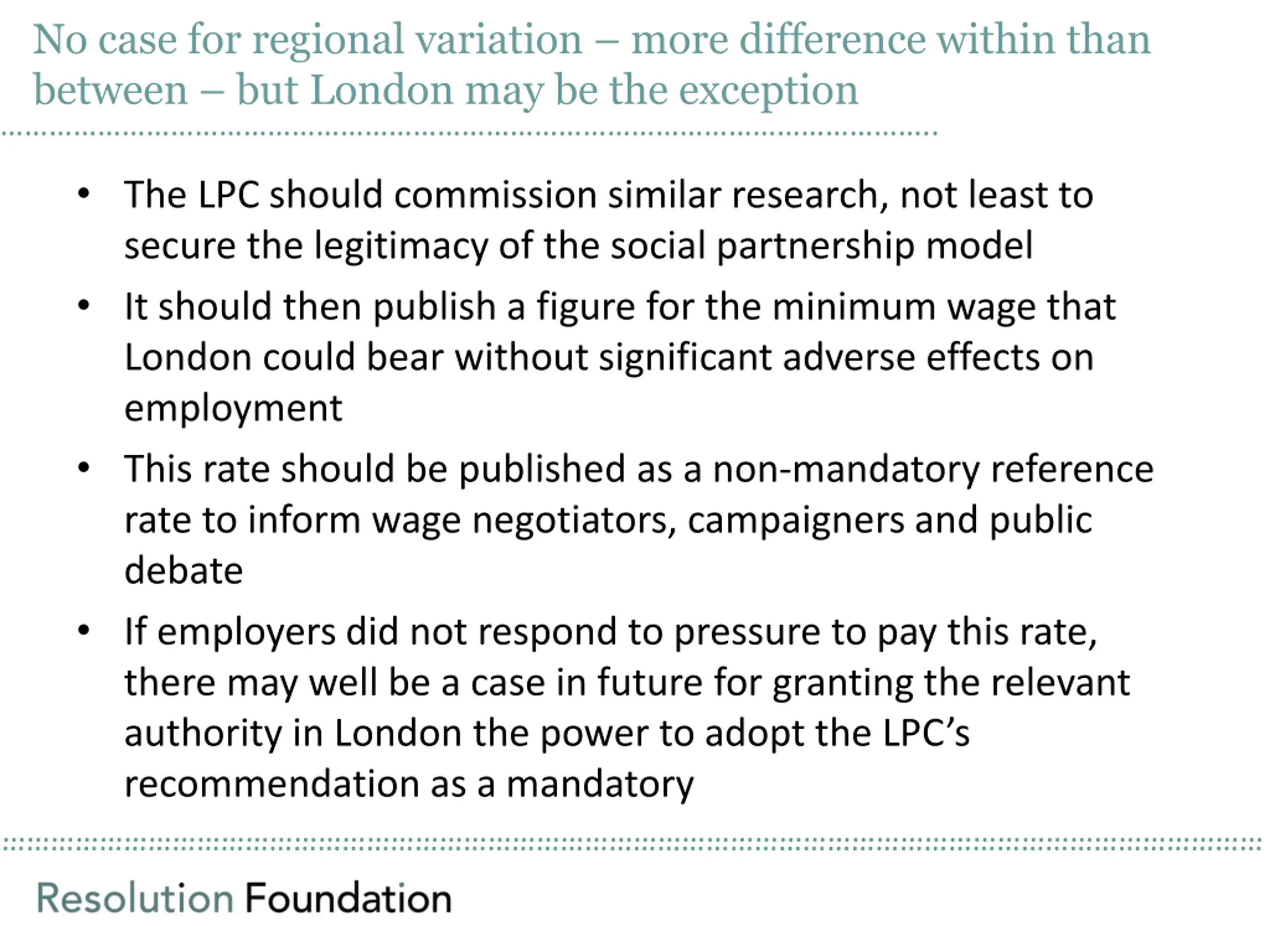 No case for regional variation more difference within than between but London may be the exception .. The LPC should commission similar research, not least to secure the legitimacy of the social partnership model It should then publish a figure for the minimum wage that London could bear without significant adverse effects on employment This rate should be published as a non-mandatory reference rate to inform wage negotiators, campaigners and public debate If employers did not respond to pressure to pay this rate, there may well be a case in future for granting the relevant authority in London the power to adopt the LPC s recommendation as a mandatory