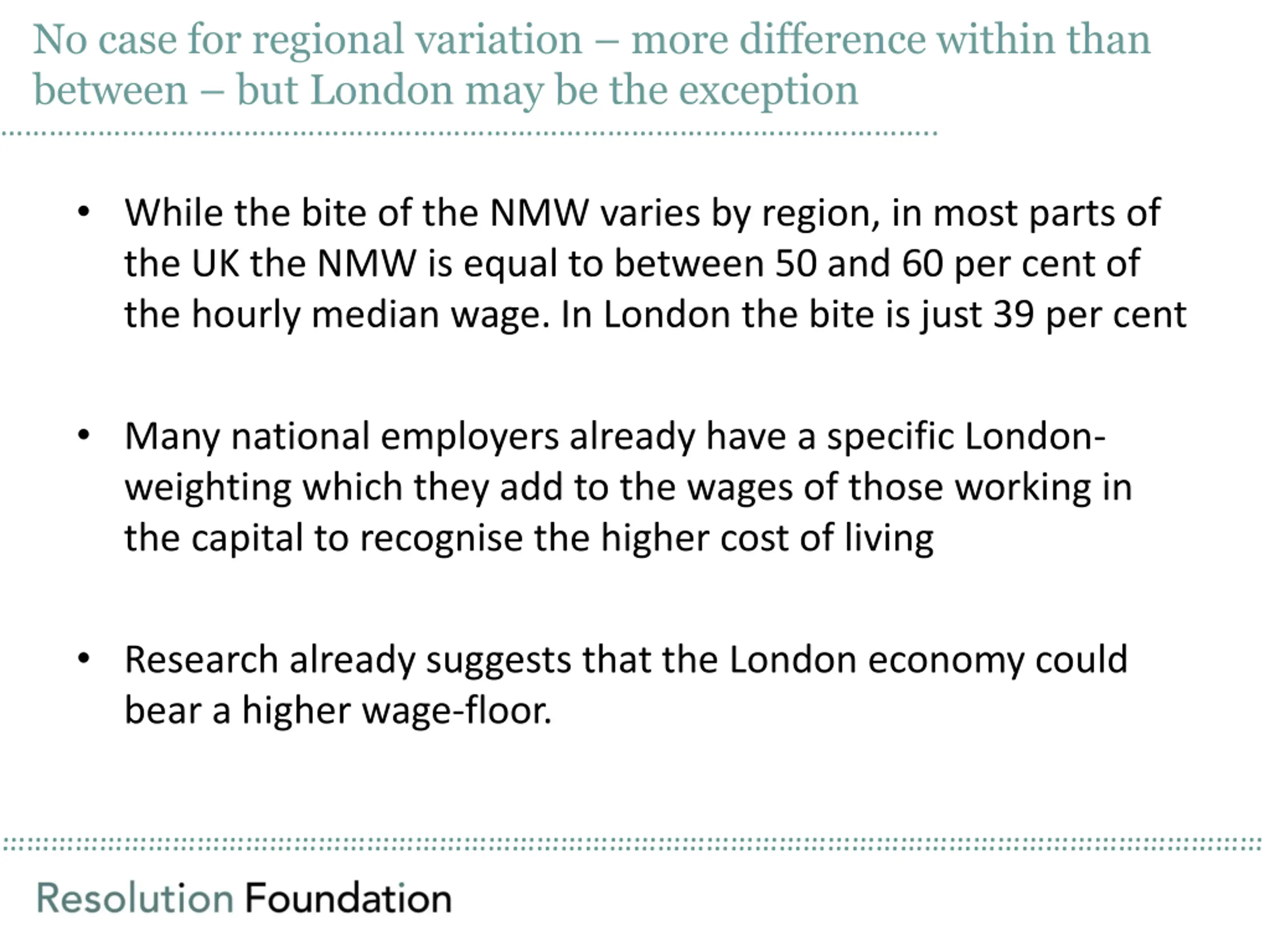 No case for regional variation more difference within than between but London may be the exception .. While the bite of the NMW varies by region, in most parts of the UK the NMW is equal to between 50 and 60 per cent of the hourly median wage. In London the bite is just 39 per cent Many national employers already have a specific London- weighting which they add to the wages of those working in the capital to recognise the higher cost of living Research already suggests that the London economy could bear a higher wage-floor.