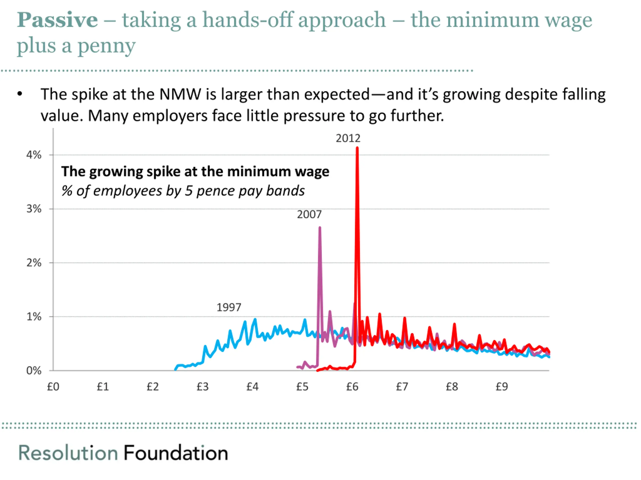 Passive taking a hands-off approach the minimum wage plus a penny .. The spike at the NMW is larger than expected and it s growing despite falling value. Many employers face little pressure to go further. 2012 4% The growing spike at the minimum wage % of employees by 5 pence pay bands 3% 2007 2% 1997 1% 0% 0 1 2 3 4 5 6 7 8 9