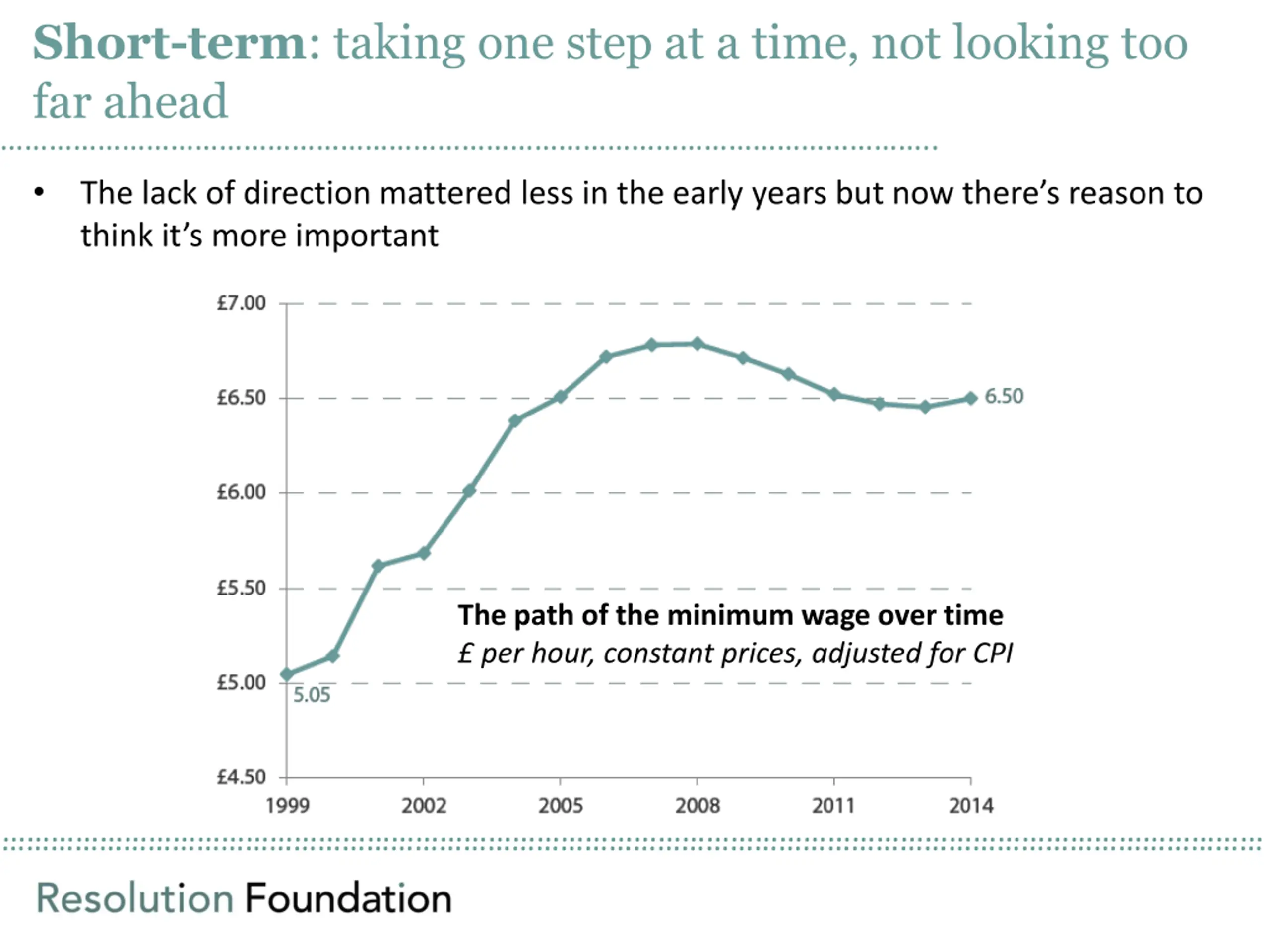 Short-term:taking one step at a time, not looking too far ahead .. The lack of direction mattered less in the early years but now there s reason to think it s more important The path of the minimum wage over time per hour, constant prices, adjusted for CPI