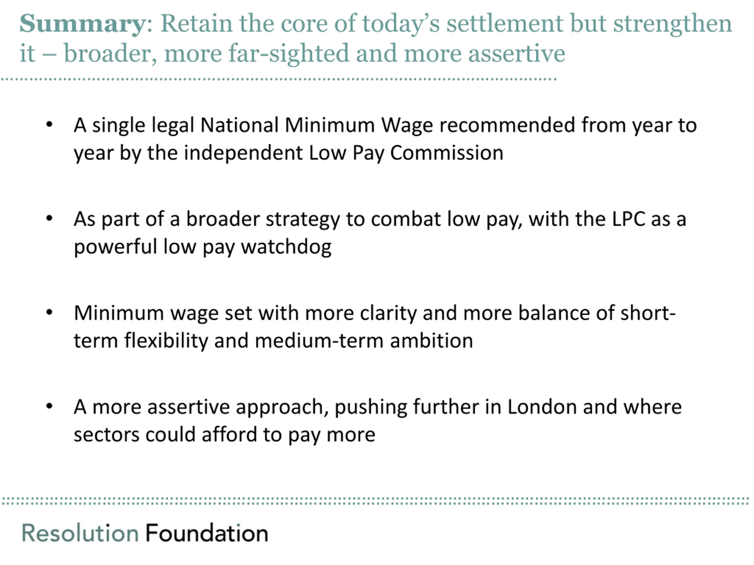 Summary: Retain the core of todays settlement but strengthen it broader, more far-sighted and more assertive .. A single legal National Minimum Wage recommended from year to year by the independent Low Pay Commission As part of a broader strategy to combat low pay, with the LPC as a powerful low pay watchdog Minimum wage set with more clarity and more balance of short- term flexibility and medium-term ambition A more assertive approach, pushing further in London and where sectors could afford to pay more