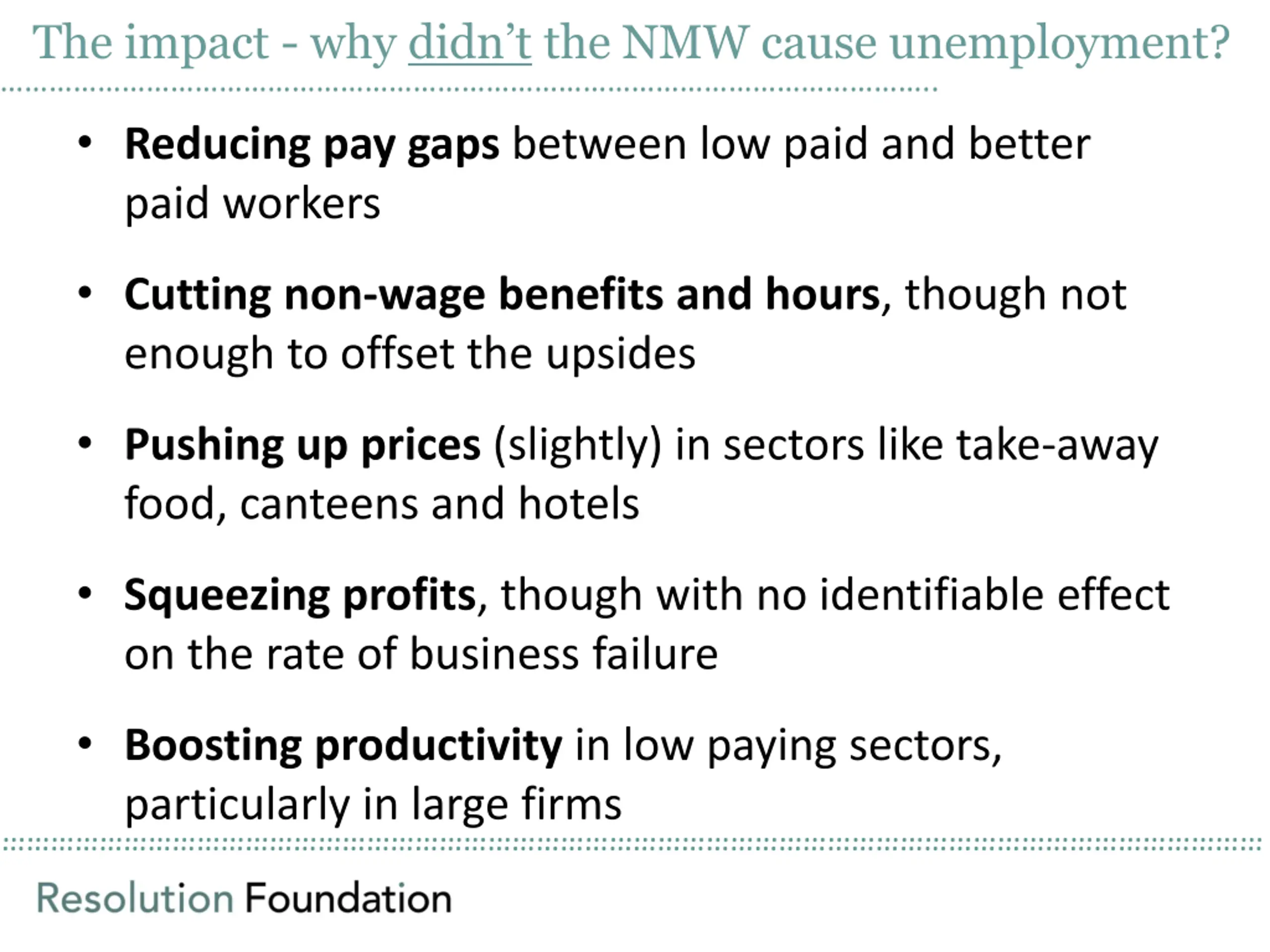 The impact - why didnt the NMW cause unemployment? .. Reducing pay gaps between low paid and better paid workers Cutting non-wage benefits and hours, though not enough to offset the upsides Pushing up prices (slightly) in sectors like take-away food, canteens and hotels Squeezing profits, though with no identifiable effect on the rate of business failure Boosting productivity in low paying sectors, particularly in large firms