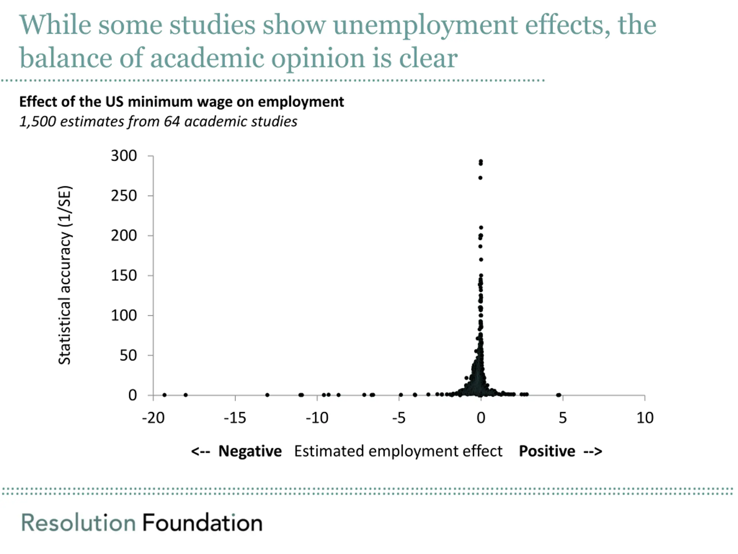 While some studies show unemployment effects, the balance of academic opinion is clear .. Effect of the US minimum wage on employment 1,500 estimates from 64 academic studies 300 Statistical accuracy (1/SE) 250 200 150 100 50 0 -20 -15 -10 -5 0 5 10 <-- Negative Estimated employment effect Positive -->