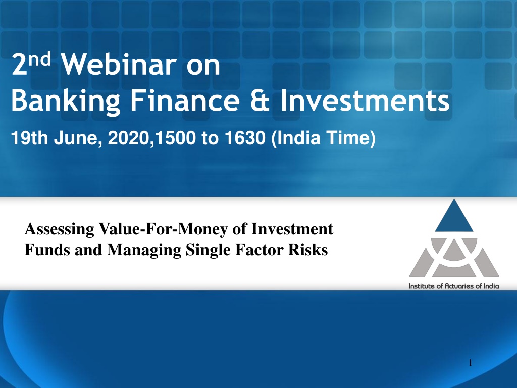 2nd Webinar on Banking Finance & Investments 19th June, 2020,1500 to 1630 (India Time) Assessing Value-For-Money of Investment Funds and Managing Single Factor Risks 1