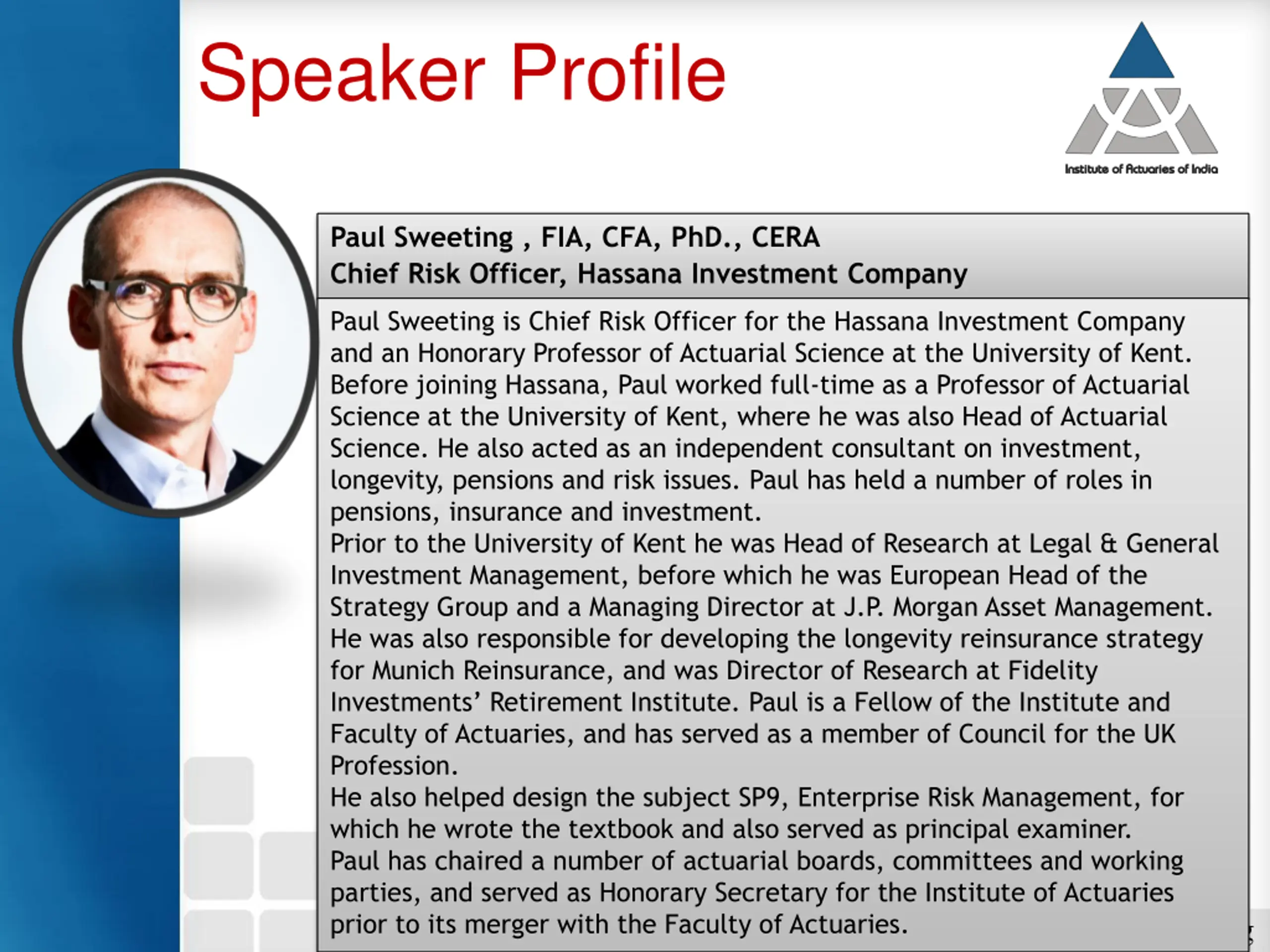 Speaker Profile Paul Sweeting , FIA, CFA, PhD., CERA Chief Risk Officer, Hassana Investment Company Paul Sweeting is Chief Risk Officer for the Hassana Investment Company and an Honorary Professor of Actuarial Science at the University of Kent. Before joining Hassana, Paul worked full-time as a Professor of Actuarial Science at the University of Kent, where he was also Head of Actuarial Science. He also acted as an independent consultant on investment, longevity, pensions and risk issues. Paul has held a number of roles in pensions, insurance and investment. Prior to the University of Kent he was Head of Research at Legal & General Investment Management, before which he was European Head of the Strategy Group and a Managing Director at J.P. Morgan Asset Management. He was also responsible for developing the longevity reinsurance strategy for Munich Reinsurance, and was Director of Research at Fidelity Investments Retirement Institute. Paul is a Fellow of the Institute and Faculty of Actuaries, and has served as a member of Council for the UK Profession. He also helped design the subject SP9, Enterprise Risk Management, for which he wrote the textbook and also served as principal examiner. Paul has chaired a number of actuarial boards, committees and working parties, and served as Honorary Secretary for the Institute of Actuaries prior to its merger with the Faculty of Actuaries. 6 www.actuariesindia.org